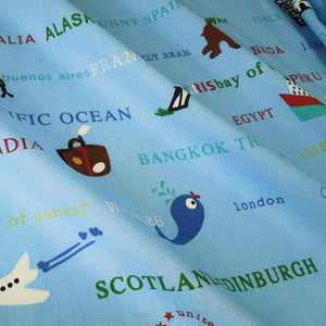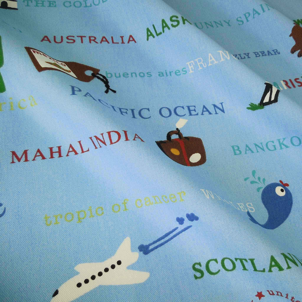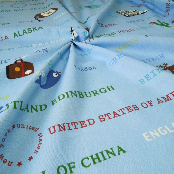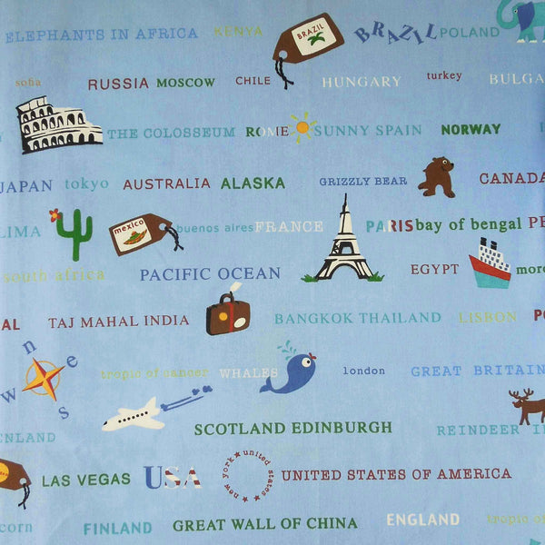 Destination fabric by Prestigious Textiles is a blue child's cotton furnishing fabric with travel descriptions, for example 'Sunny Spain', 'Reindeer in Greenland' in coloured writing and plus little pictures as well all on a blue background. A fun fabric for small. children.