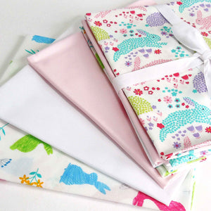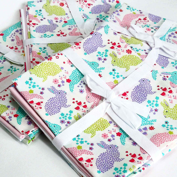 A pretty rabbits and flowers fat quarter bundle by Rose & Hubble. There are 2 different rabbits and flowers fabrics and 2 additional coordinating fabrics. The pack contains 4 fat quarters in 4 different designs, perfect for many quilting or craft projects. The packs are tied with white cotton tape.