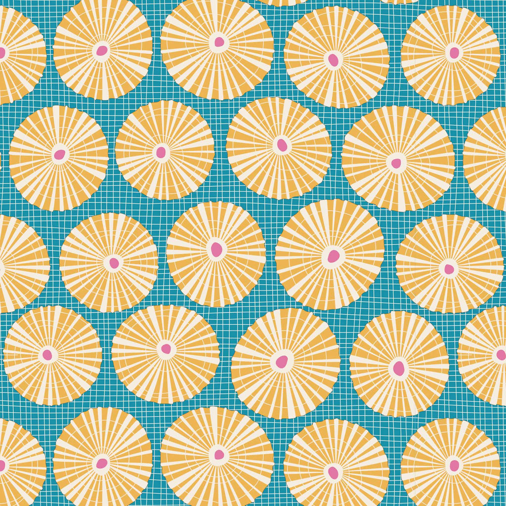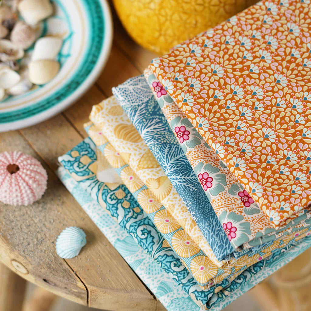 Cotton Beach is the perfect name for a coastal cotton fabric collection. Shells, coral reefs, and sea anemones are some of the motifs that inspired the mixed style designs. Colours vary from purples to dark and light corals, sandy greys, light, and green teals and blues, and yellows to represent sunshine.