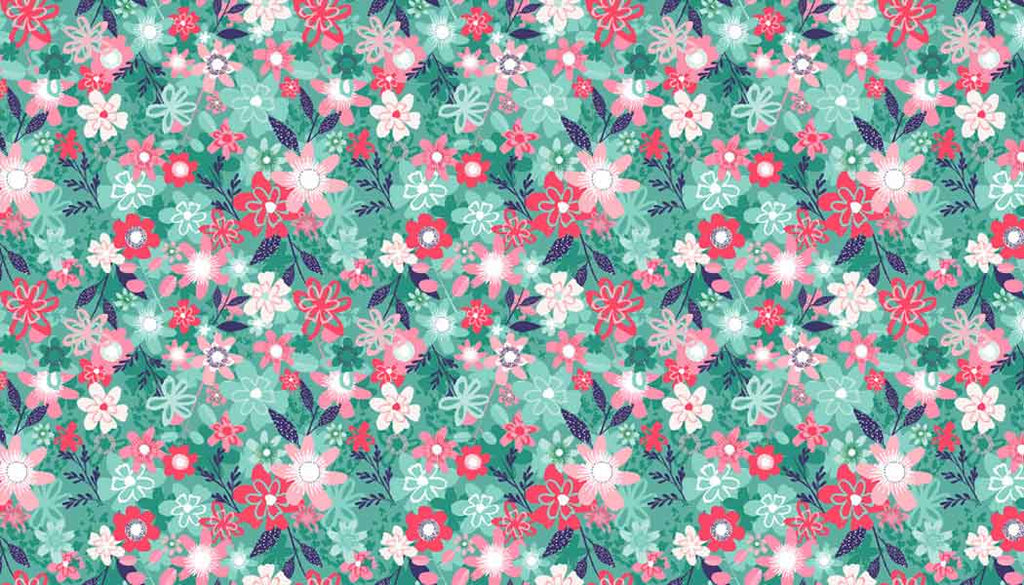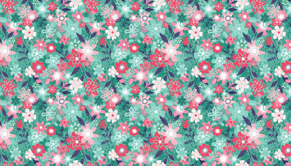 Floral Blue is a lovely pink, blue, green and white cotton flower fabric by Makower 1945/B which is part of their Fruity Friends collection. There are pink and white flowers of various sizes scattered across the teal or blue/green background together with sprays of dark blue leaves.