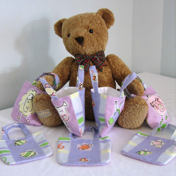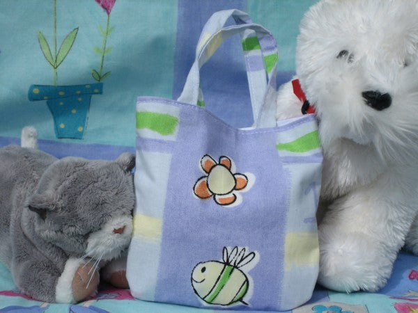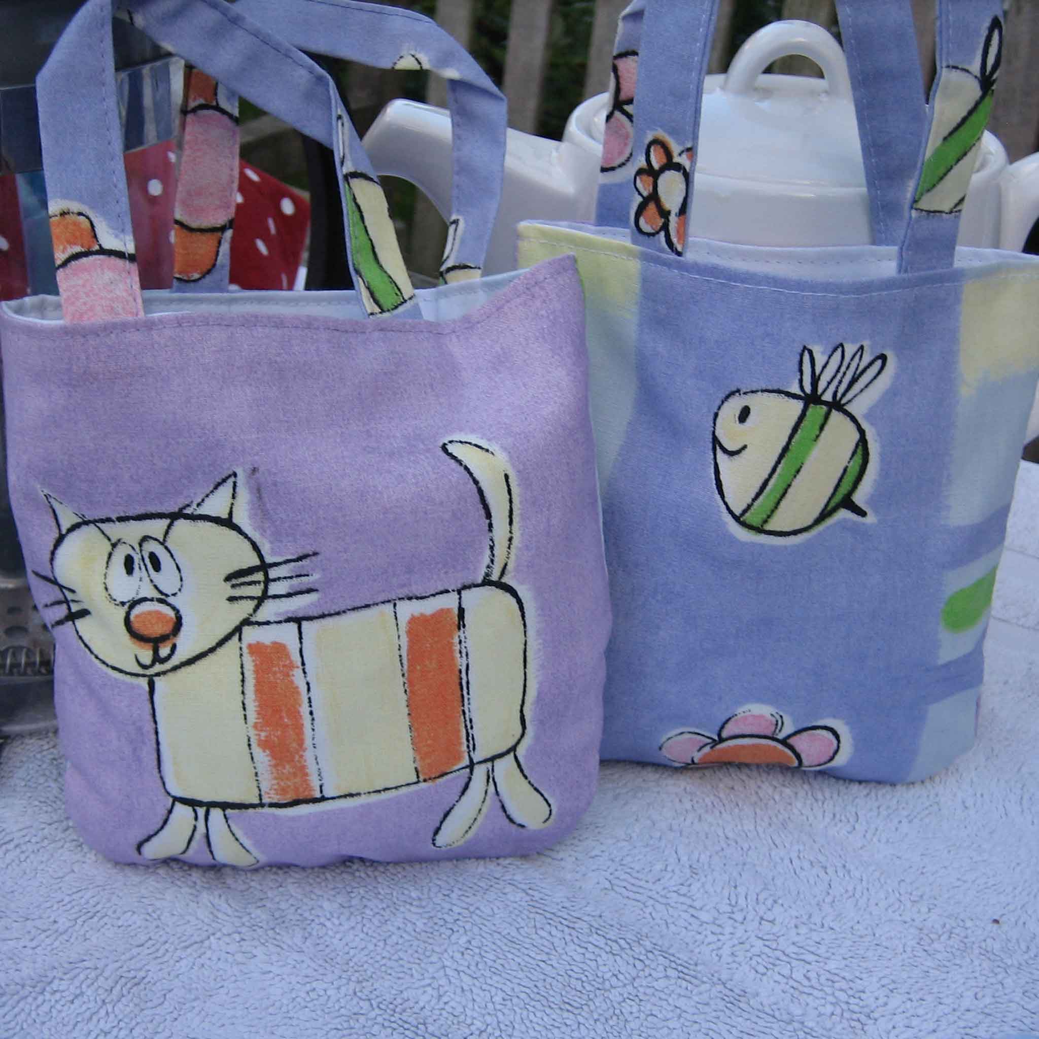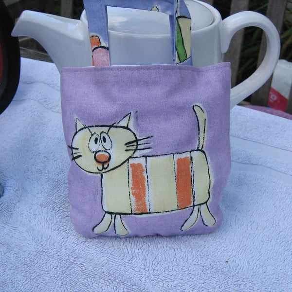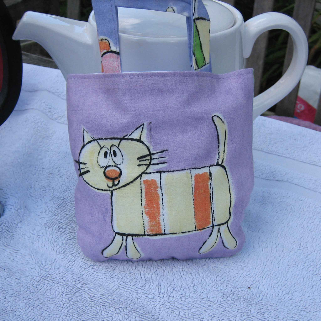 A beautiful children's Carrie the Cat small tote bag, perfect for little hands. This has been handmade in a cute lilac animal print pure cotton and fully lined in white cotton.