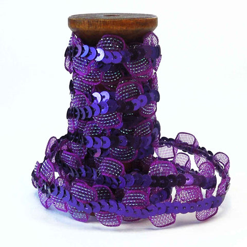 15mm Sequins and Organza Trim - Purple - Wooden Spool - 2 Metres
