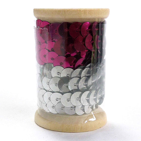6mm Flat Sequin Trim on Wooden Bobbin - Fuchsia - Silver - 2 metres
