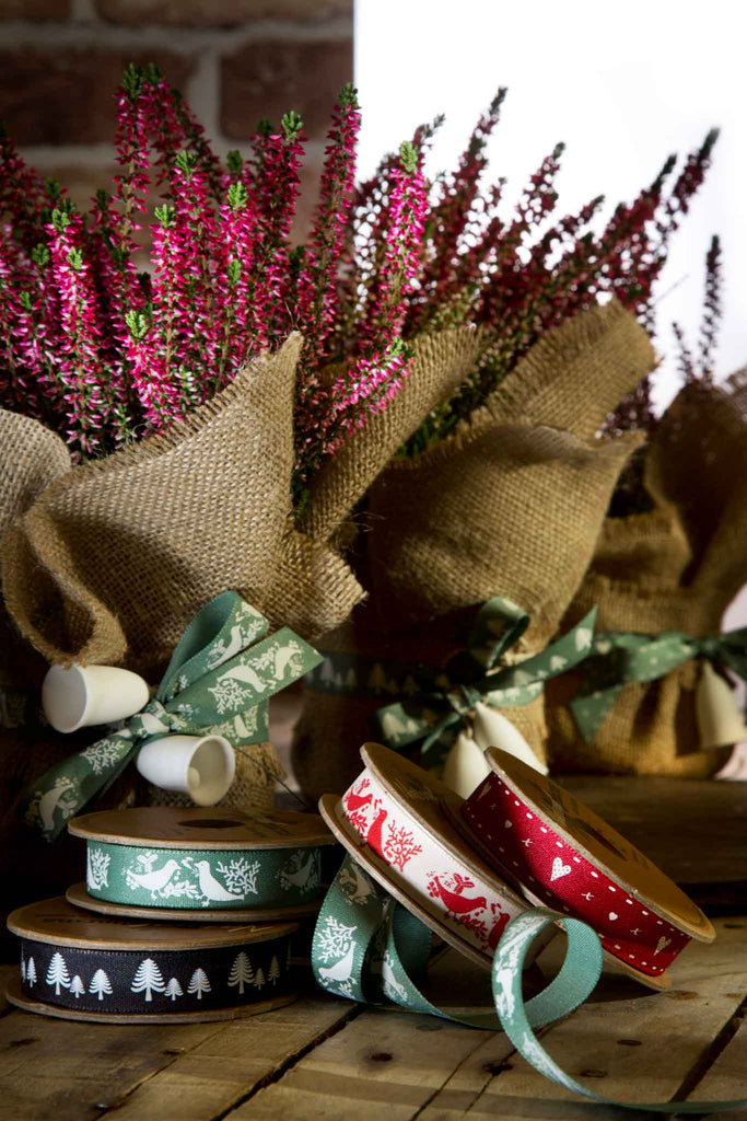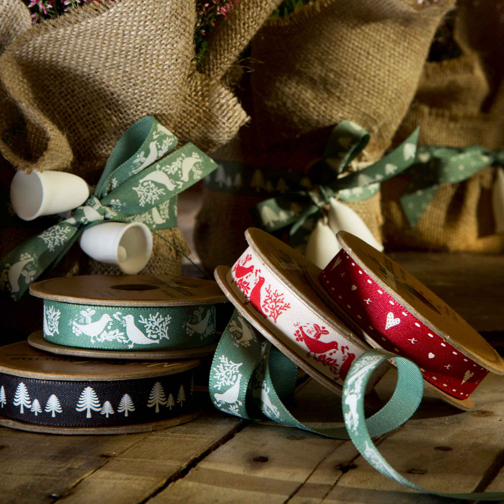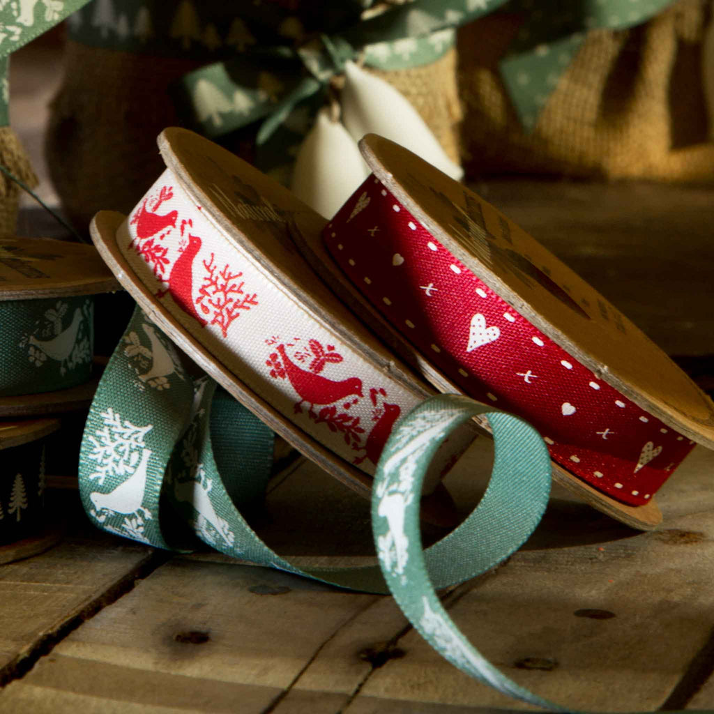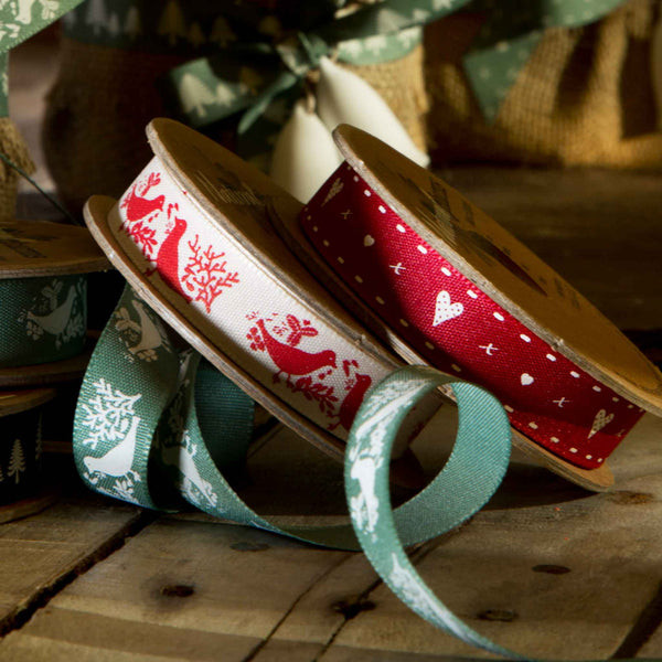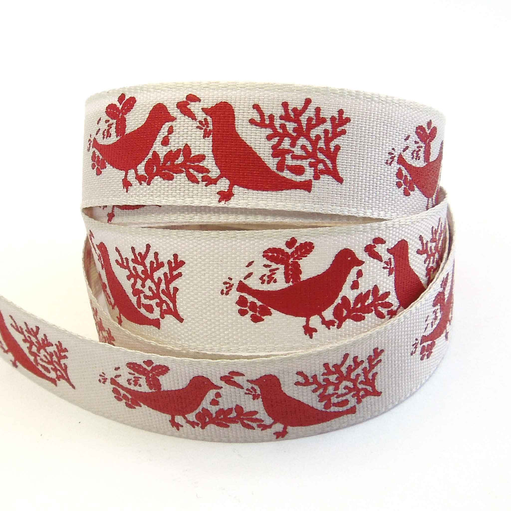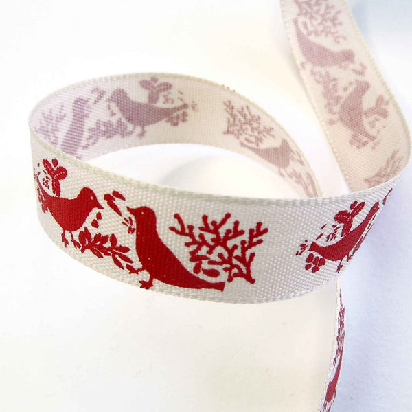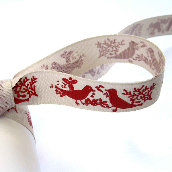 A pretty red Turtle Dove Ribbon, 15mm or 5/8 inch wide with a lovely pattern of pairs of red turtle doves on a cream or off-white background.. The birds are facing each other and surrounded by leaves and twigs all in a red colour on an cream background. Part of Berisfords Woodland Walk Collection in the Natural Charms range.