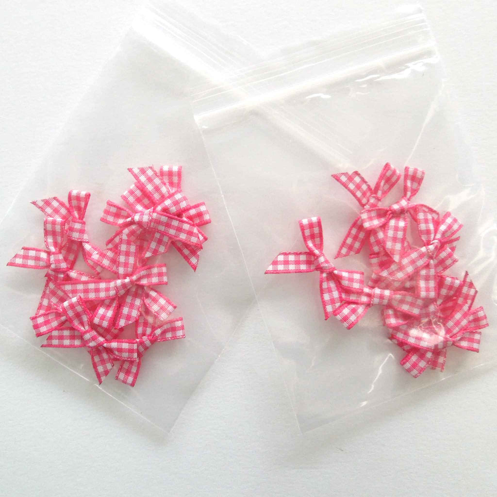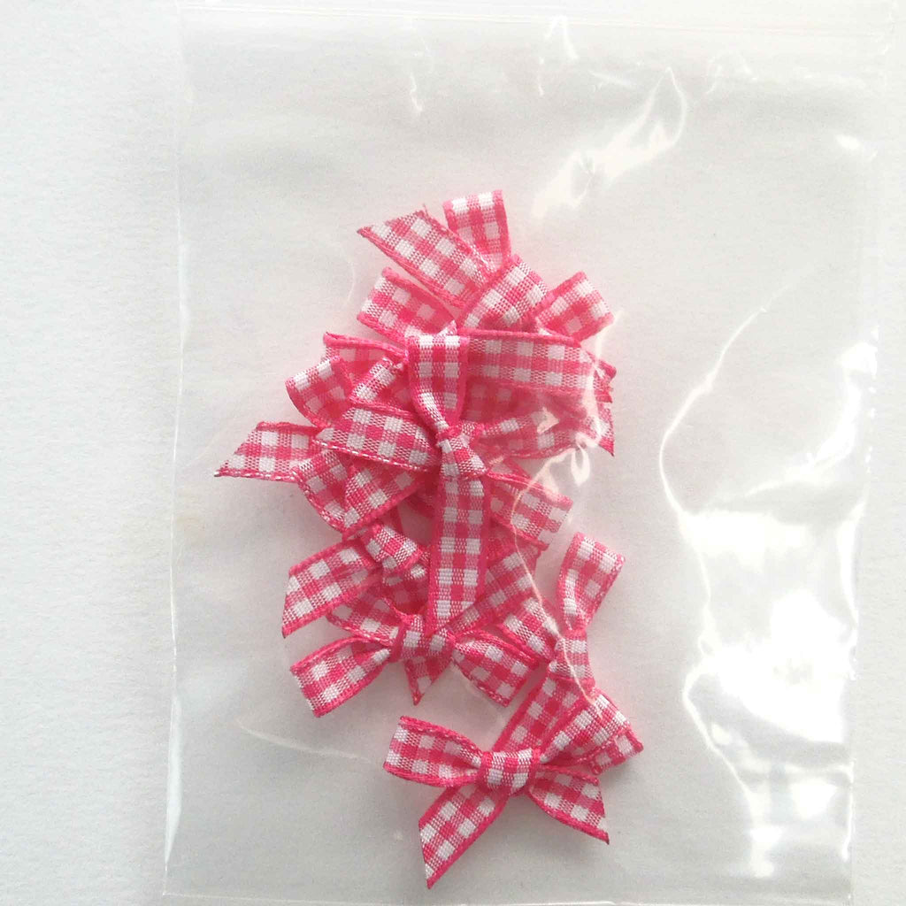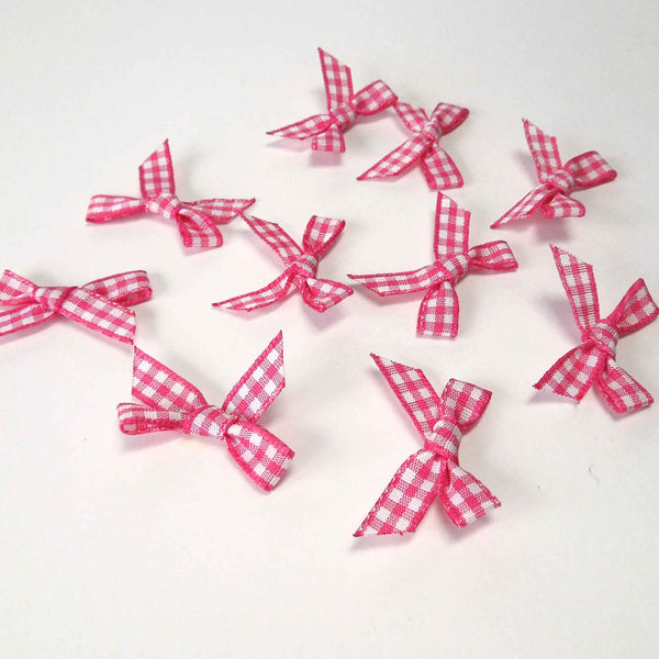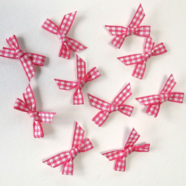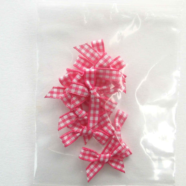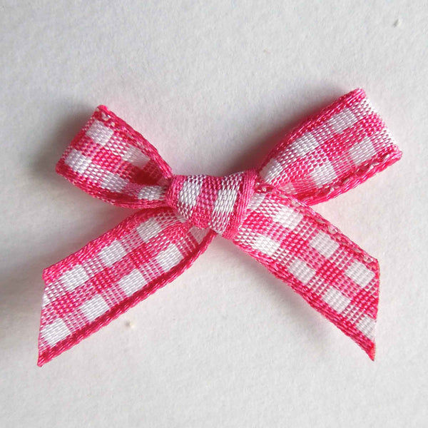 Pretty bright pink gingham ribbon bows pre-tied in 7mm gingham ribbon. These bows are perfect for crafts, handmade cards and sewing projects. The pink colour would be suitable for weddings and christenings.