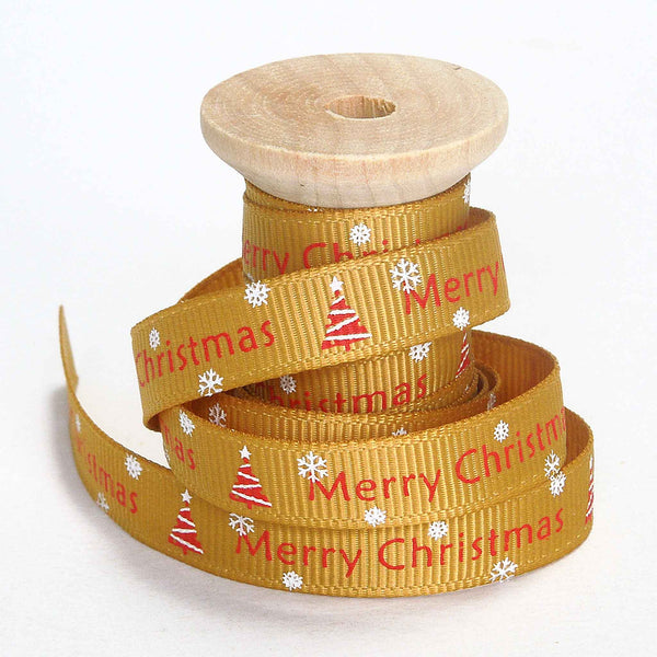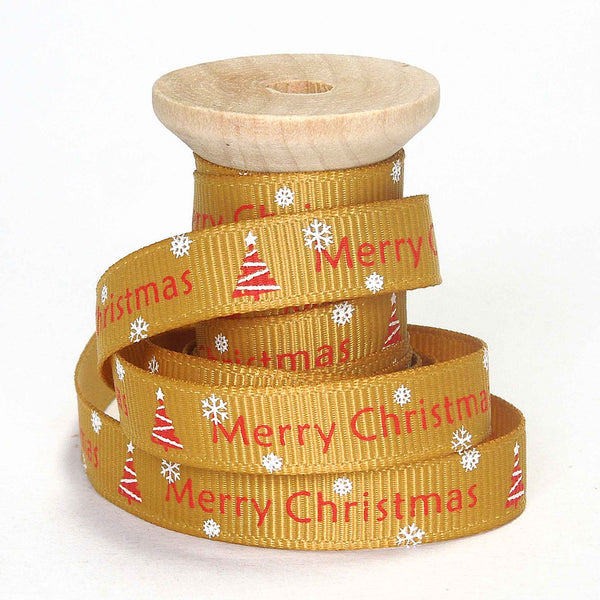 10mm Gold Merry Christmas and Trees Grosgrain Ribbon on Wooden Bobbin - 2 Metres