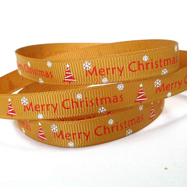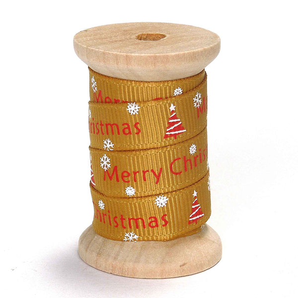A festive 10mm gold grosgrain style Christmas ribbon with Merry Christmas in red and red and white Christmas trees and white snowflakes on a gold background wound onto a wooden spool.