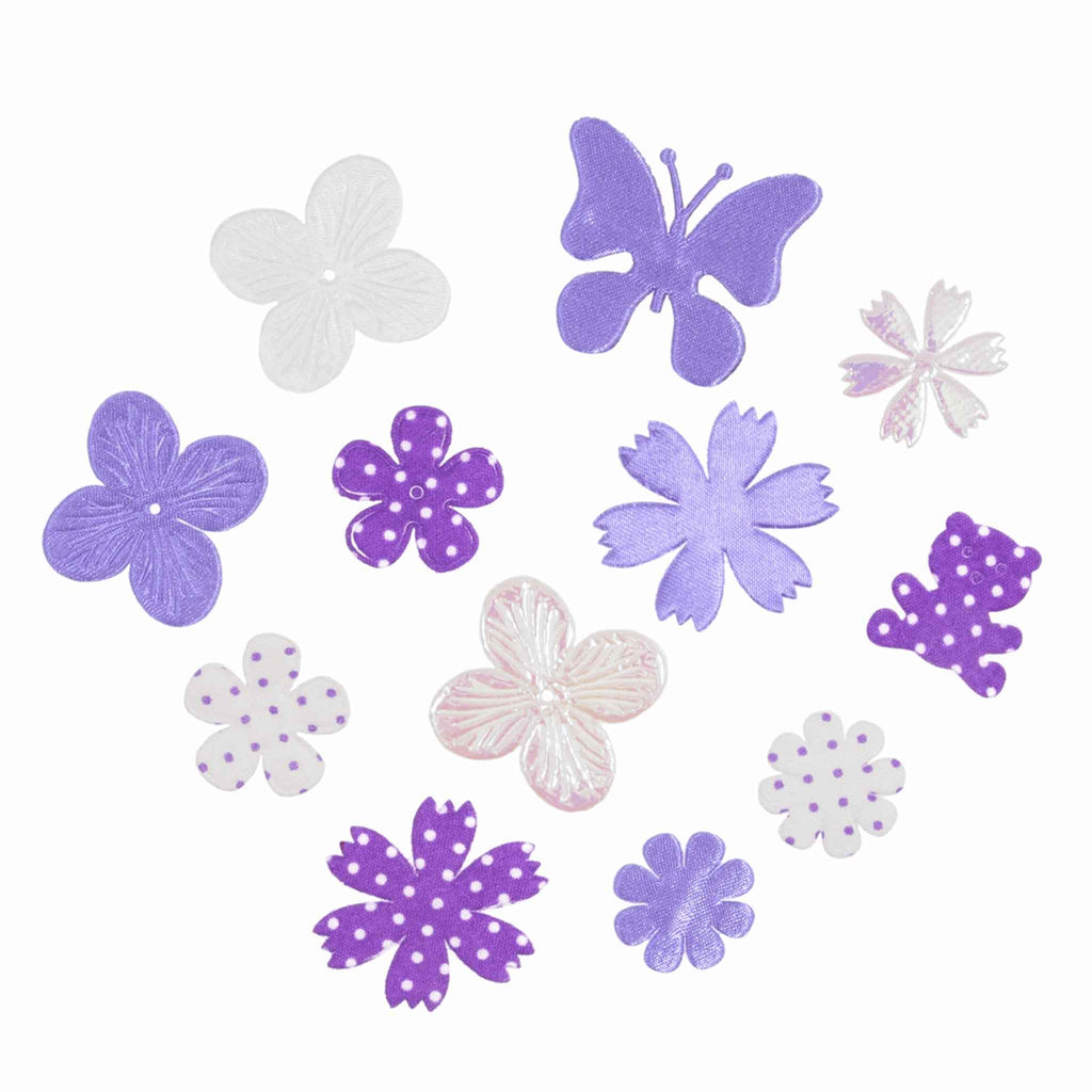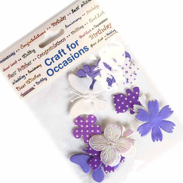 A pretty purple fabric flower mix craft pack consisting of purple, lilac, pink and white flowers, butterflies and little bears. This craft pack is perfect for all your crafts, presents, scrapbooking and gift wrapping.