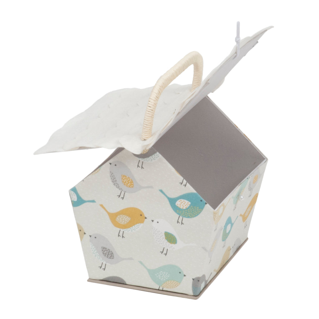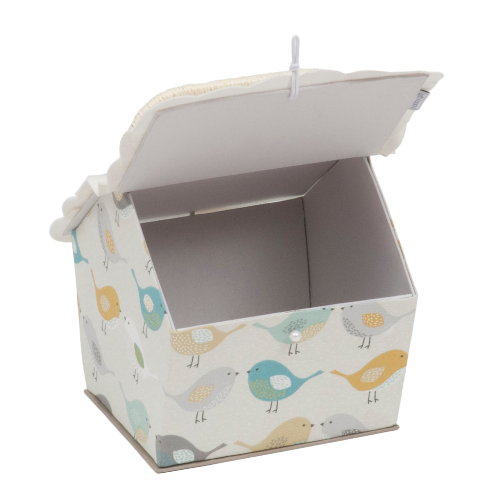 A pretty birdhouse sewing box decorated with colourful birds.The roof lifts up for access to the interior and it has a useful handle so you can carry it with you and sew on the go. There is a pale cream felt roof with coloured felt applique birds.