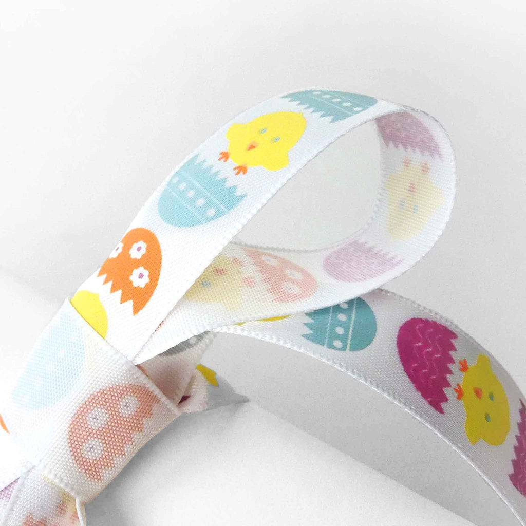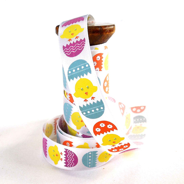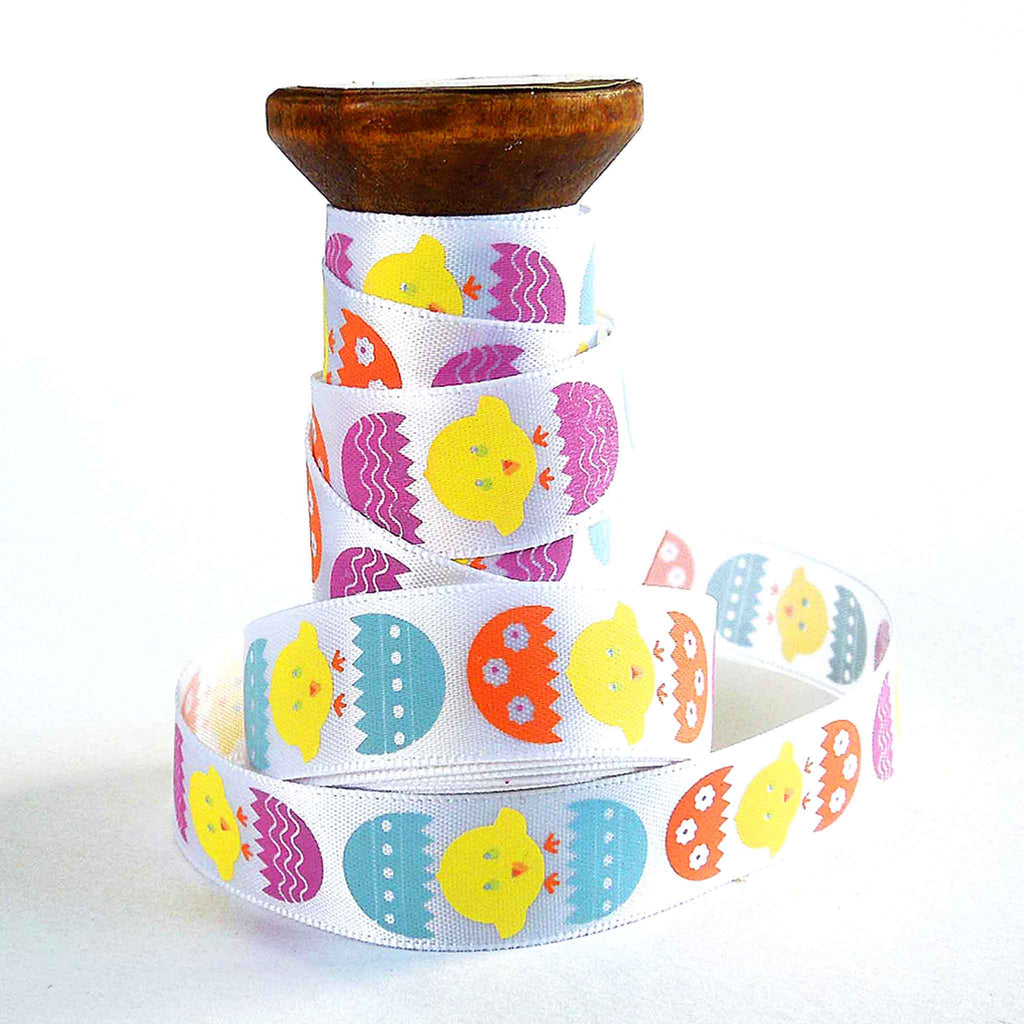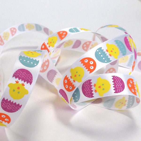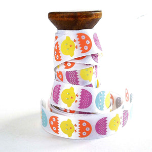 A fun Purple Easter Egg and Chicks white satin ribbon, 15mm or 5/8 inch wide with a row of coloured Easter Eggs in purple, blue and orange with a sweet little chick hatching out, printed on a white satin ribbon and all ready for Easter.
