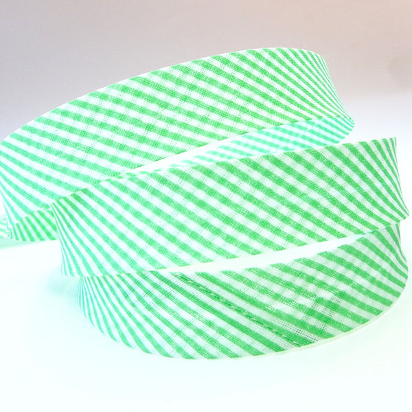 A fresh, crisp bias binding with narrow green stripes on a white cotton background. This is a single fold cotton bias binding with the two outer edges folded in.
