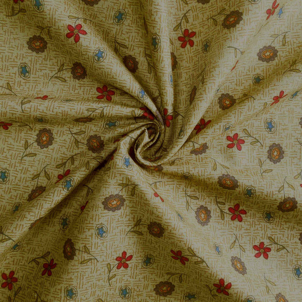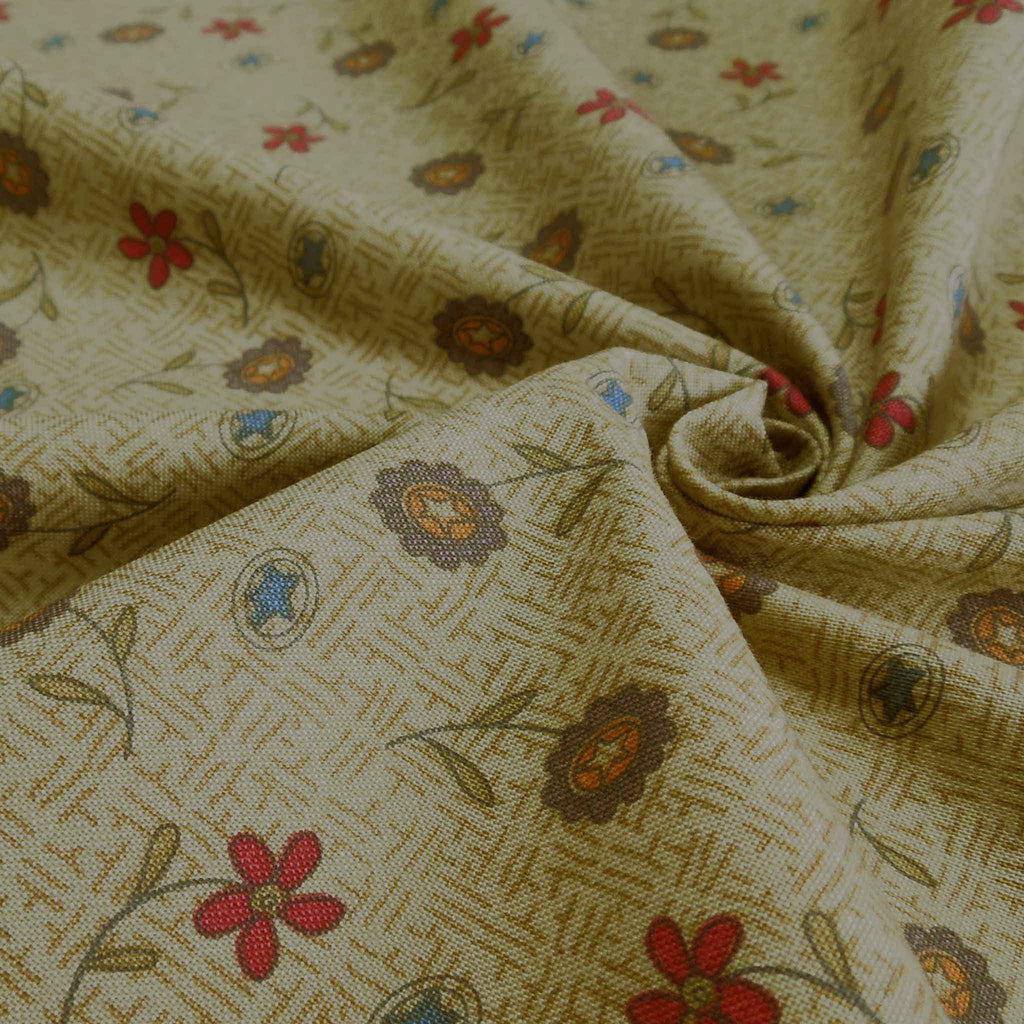 It is a pretty shabby chic cotton fabric with a pattern of two different daisies both on green leafy stems scattered across a green background. One of the flowers is a red 5 petalled daisies on a little stem with 2 green leaves and the other is a daisy with a circle of little purple petals surrounding an orange centre containing a little yellow heart, all in a gorgeous retro style. The green background has a fine basket weave pattern all over it in darker green lines.