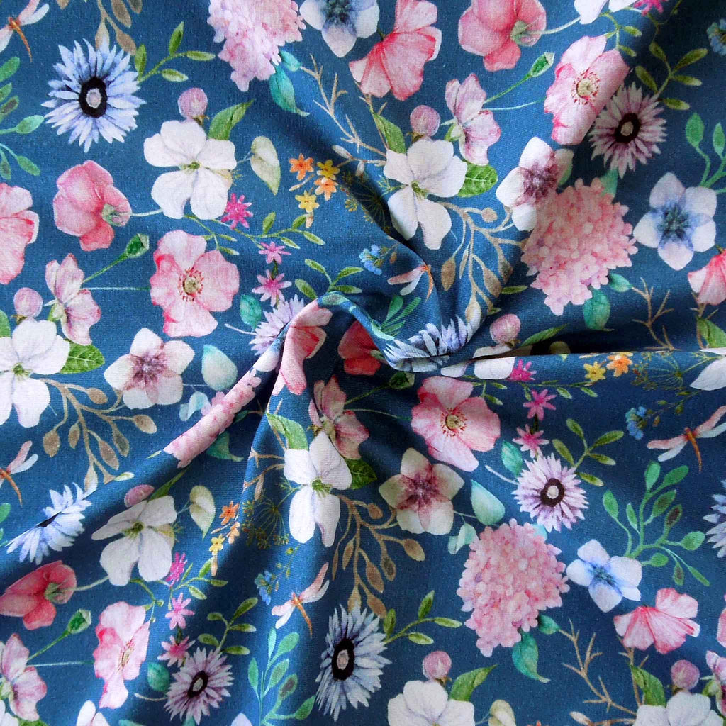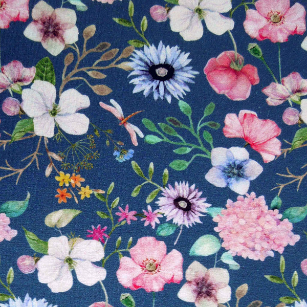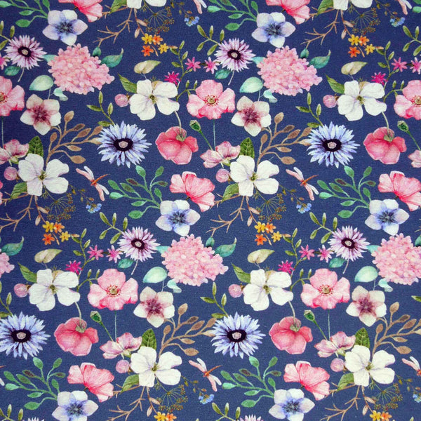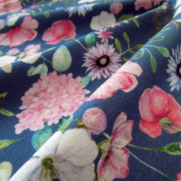 A pretty flowers and poppies fabric in soft shades of pink, lilac, mauve, yellow and white for the flowers plus green and beige leaves on a denim blue background. With a smooth stretchy finish these jersey prints are perfect for craft, clothing and dressmaking!