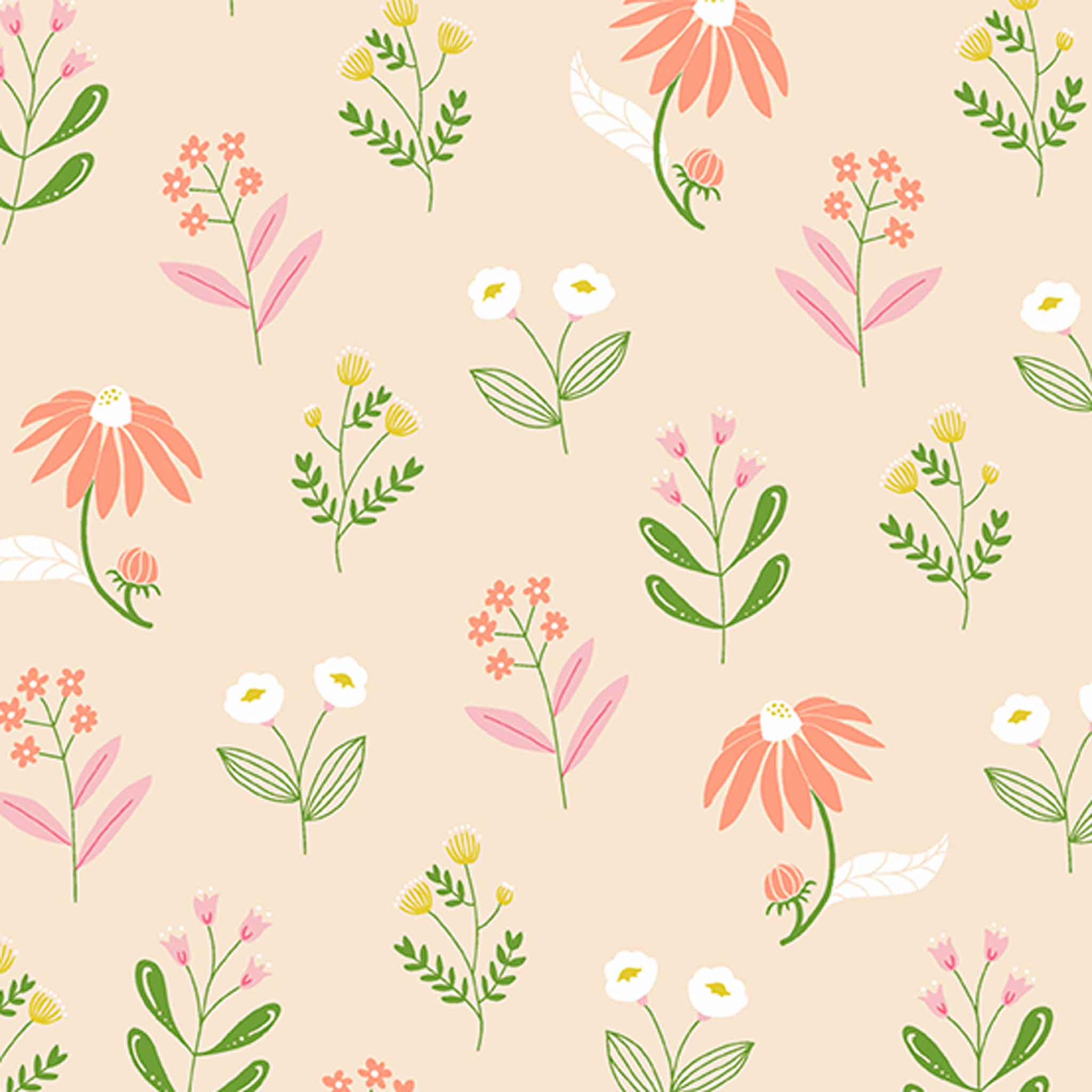 Apricot Wild Blooms cotton fabric by Andover Fabrics 511/E, is from their Moonlit Garden collection by Patti Sloniger. There are individual orange, pink, yellow and white flowers with green stems and leaves scattered across an apricot coloured background.