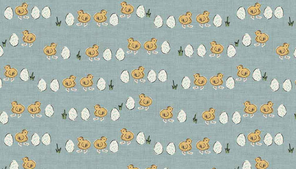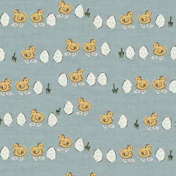 Blue Chicks and Eggs cotton fabric by Makower 1779/B is from their Home Grown Collection. There are rows of little yellow chicks, white eggs and clumps of green grass on a mid blue background in a repeat pattern.