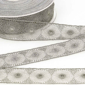 This is a top quality 30mm medium grey embroidered lace tulle by the French brand Stephanoise. The lace has a pretty decorative embroidered pattern with a decorative circular pattern running down the length of the lace.