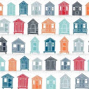 Coloured Beach Huts on White cotton fabric by Makower, part of their Marina collection,1770/1 is a lovely pure cotton seaside fabric with a repeating pattern of rows of coloured beach huts in red, orange, green, blue, black and grey on a white background.