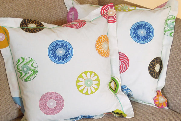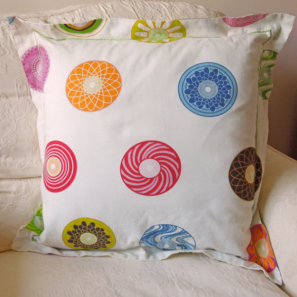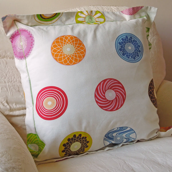 Bright Circles Cushion, Handmade in a Multicoloured Cotton Circle Print with Satin Stitch embroidery, 21 inch x 21 inch, 53 cm x 53 cm