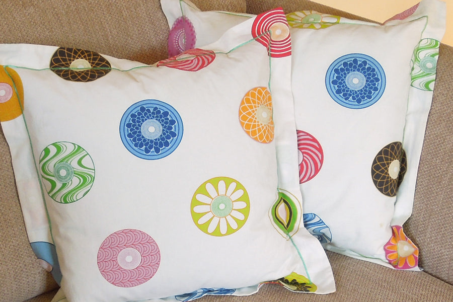 This beautiful circles cushion has a pretty embroidered satin stitched edging in a light green thread and a generous flange round the cushion to produce a feeling of luxury and elegance.