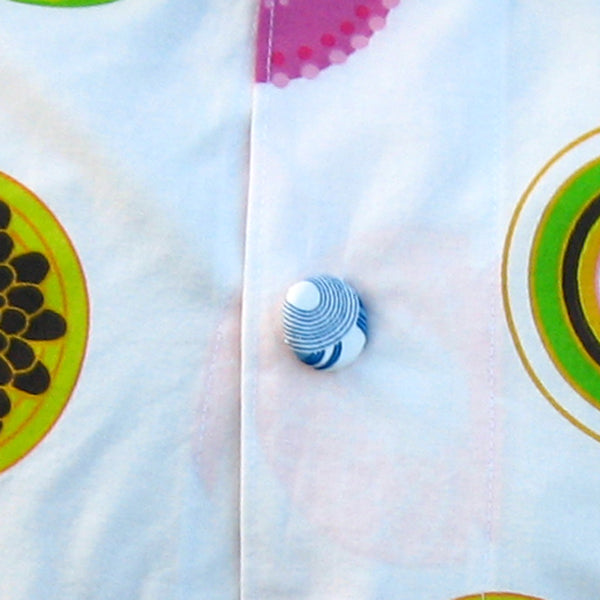 The back of the cushion is made in the same elegant circles fabric with an overlapping flap fastened by 2 buttons covered in the same fabric.