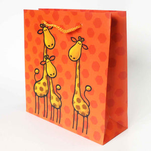 A fun paper gift bag with a cute design of a giraffe family on an orange patterned background.  The orange cord handles complement the design and match the colours. The bag has a white interior.