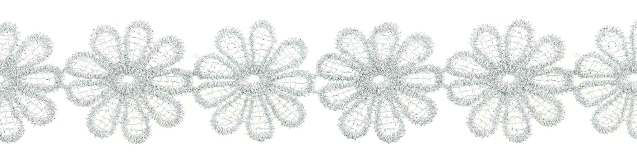 A delicate 35mm silver floral guipure lace trim. There is a flat row of silver metallic flowers all joined together to form a continuous trim. This is a quite a strong, sturdy trim and will hold its shape.