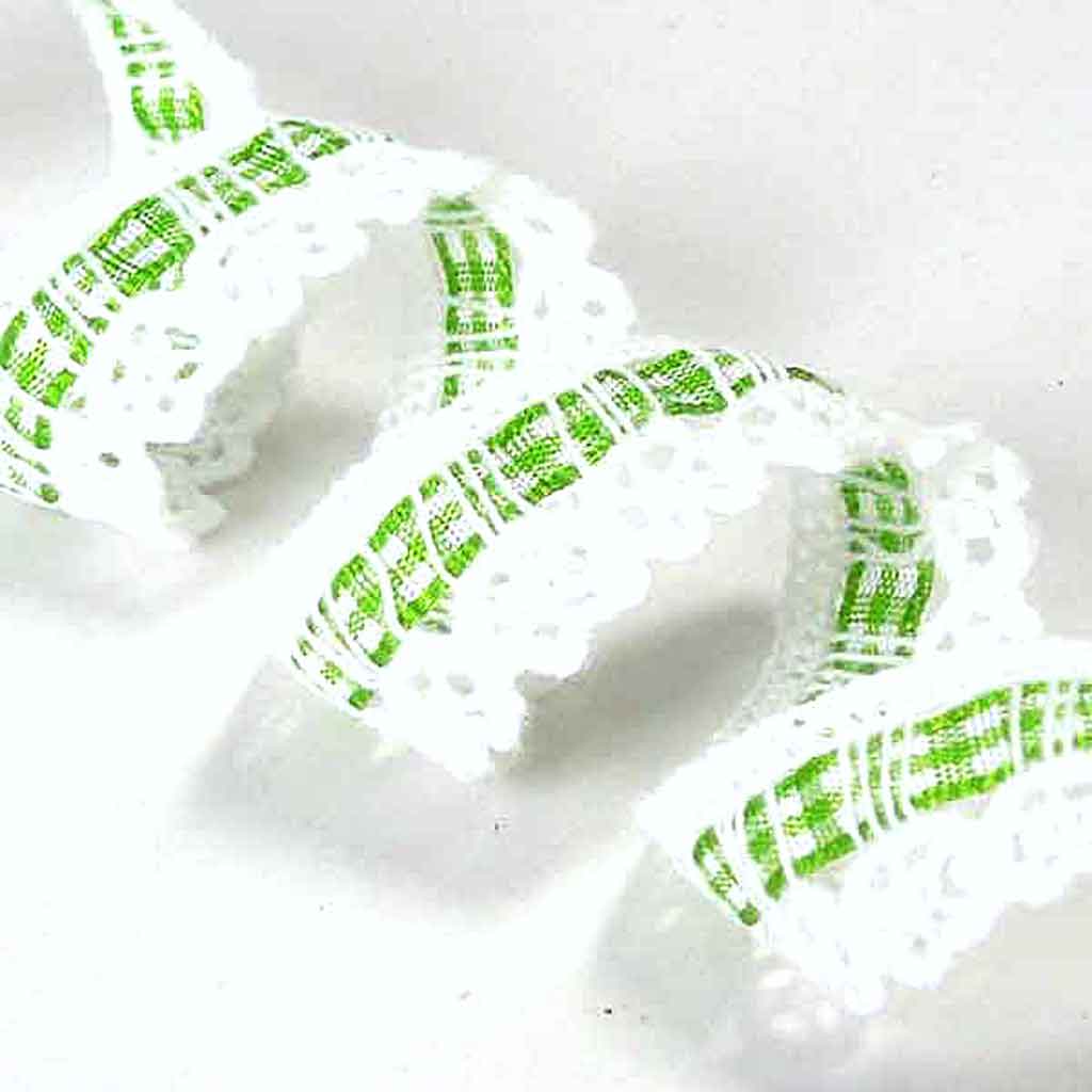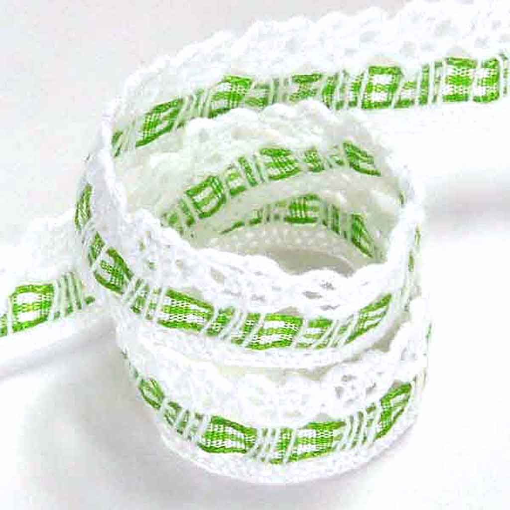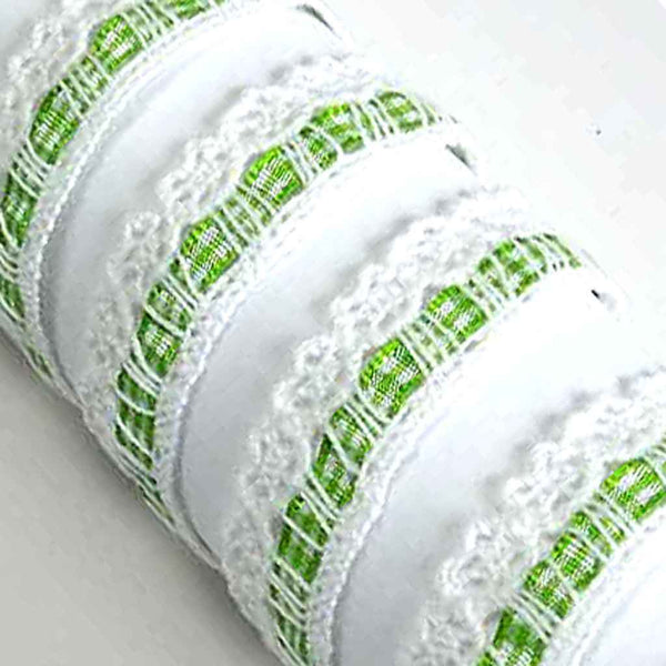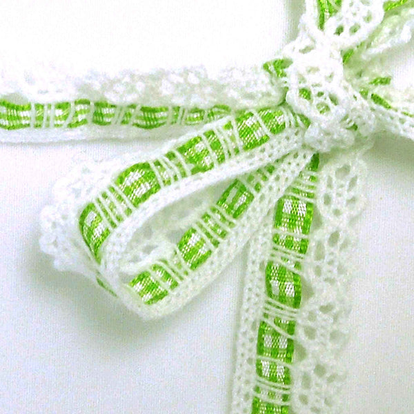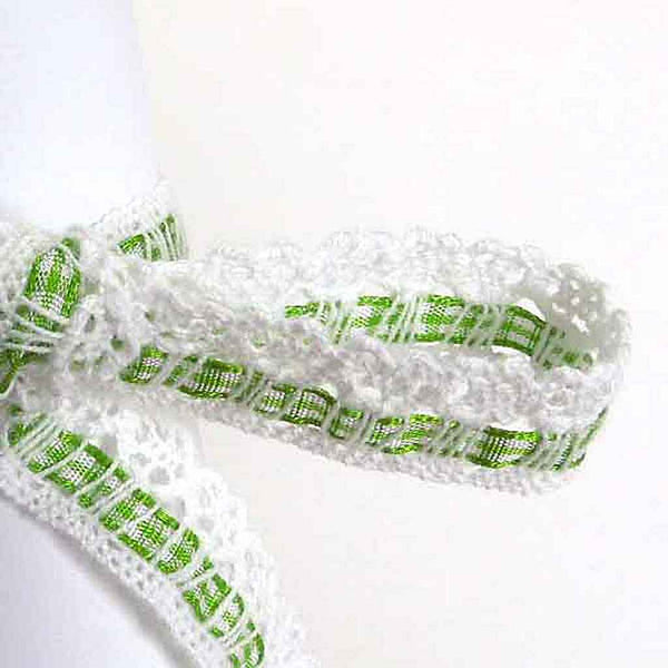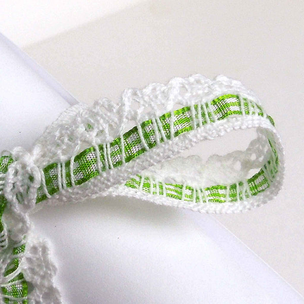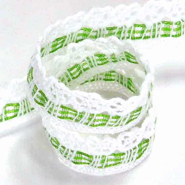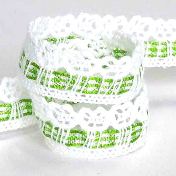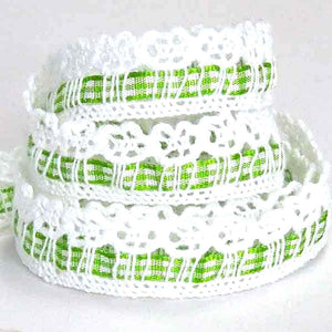 White Cotton Lace with Gingham Ribbon Insert - Fresh Green - 15mm