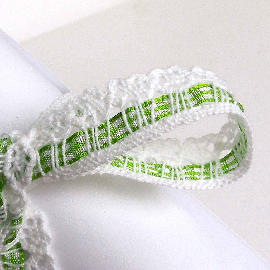 A dainty 15mm white cotton lace threaded with a pretty green gingham ribbon. The cotton lace has a delicate pattern at the top with the green gingham ribbon threaded through the lace in the middle and a strong narrow bottom edge below the ribbon. This is a quite a strong, sturdy lace and will hold its shape.