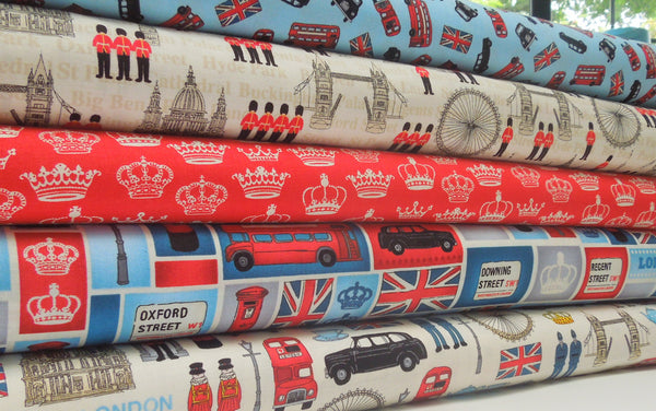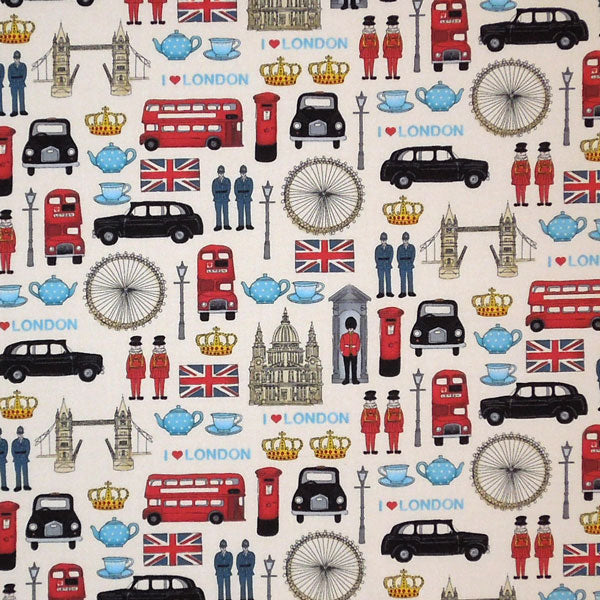 London Icons by Makower is part of their London Collection. This is a beautiful pure cotton fabric with a repeating pattern of different London images; red Routemaster buses, black London taxis, the London Eye, Beefeaters from the Tower of London, Tower Bridge, St Paul's Cathedral, red postboxes, plus many other iconic images in a repeating