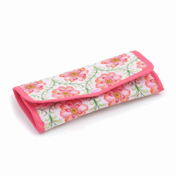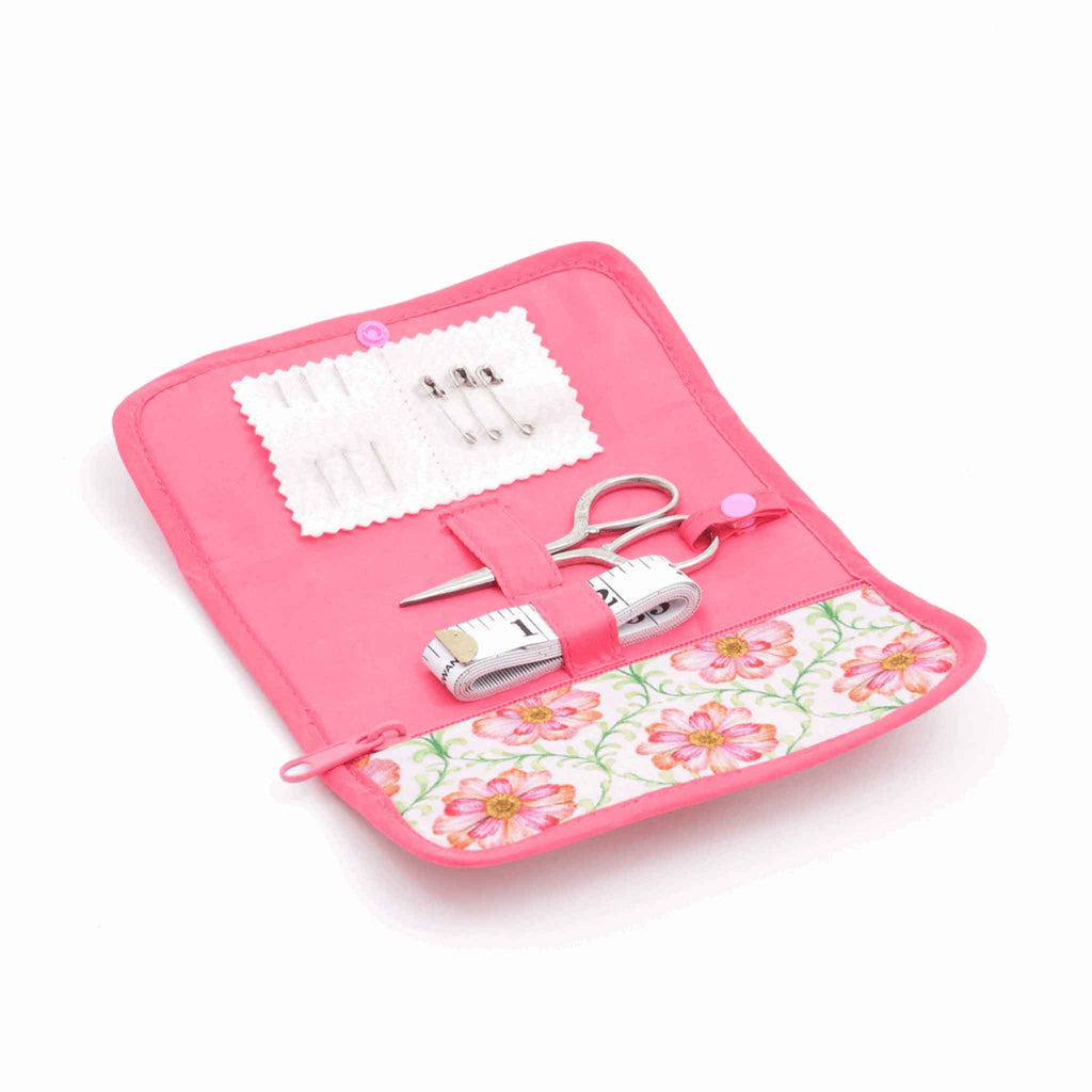 This pretty pink flower sewing kit is perfect for your everyday sewing needs and quick fixes. It is a compact fabric roll with secure snap fastener. There is also a zipped compartment to safely store other sewing necessities. It has a bright blossoming trellis flower design on the outside, lined with pink on the inside and bound with pink edges.