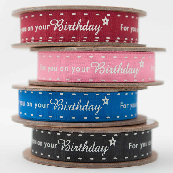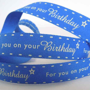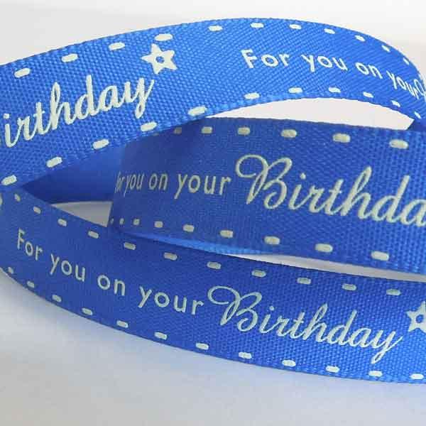 A pretty 15 mm blue birthday ribbon, 'For you on your Birthday' by Berisfords. It is a great ribbon for your birthday or party celebrations with 'For you on your Birthday' in white writing running down the middle of this bright blue ribbon. It's finished with a little white star, plus a row of white stitching along each edge to create a fun birthday ribbon for all ages.