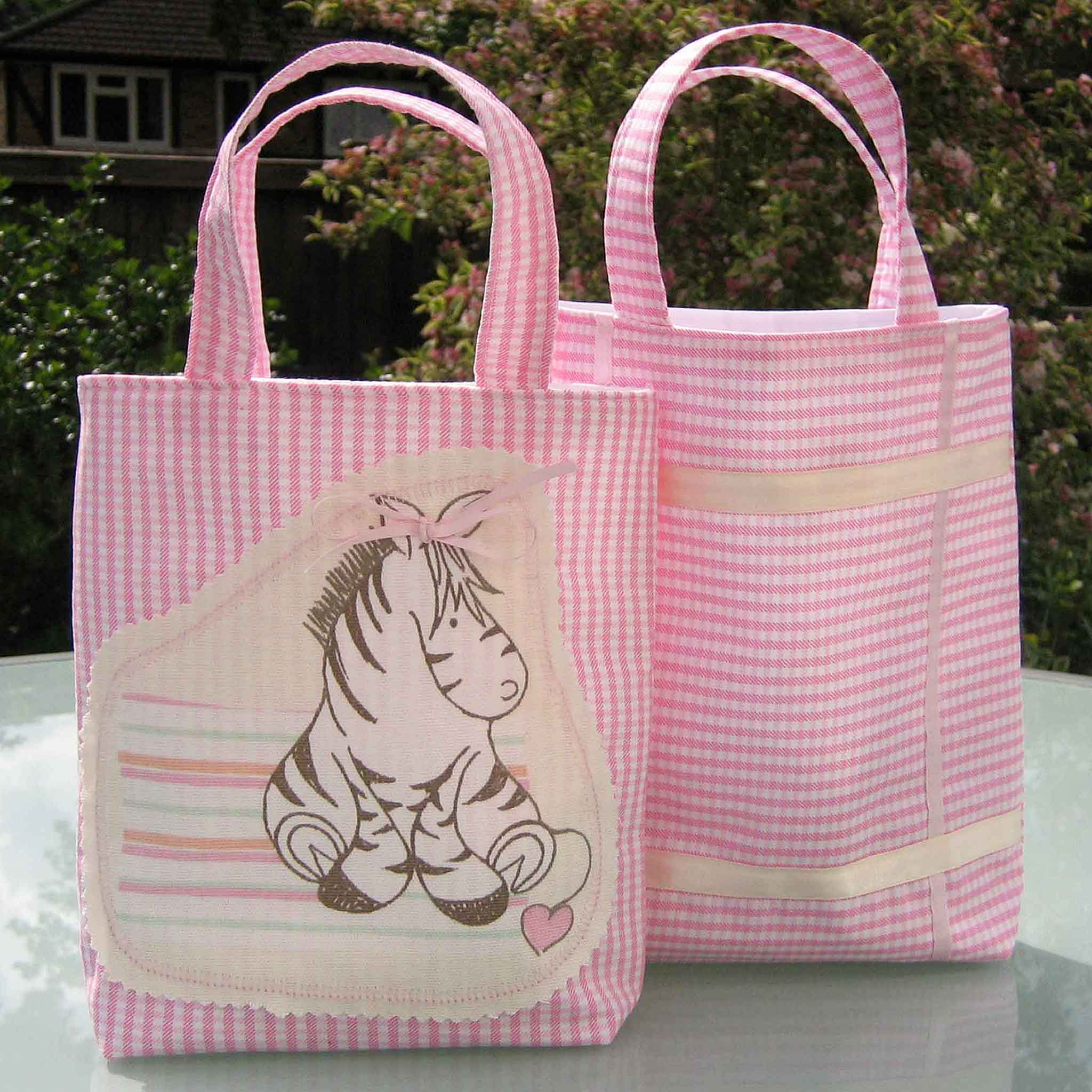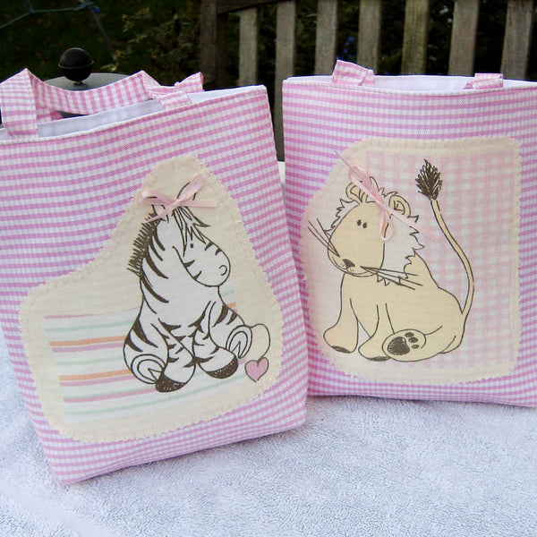 This bag has been handmade in a pink gingham with a cute cream zebra applique on the front, ribbon decoration in both cream and pale pink ribbons on the back and fully lined in white cotton. The bags and handles are also topstitched to keep their shape. The zebra has a pale pink ribbon bow to keep its mane tidy.