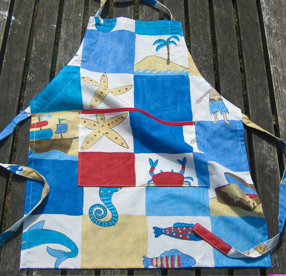 The Treasure Island apron is a practical child's apron handmade in a wonderful Treasure Island themed design with treasure chests, pirate ships, starfish and lots of other Treasure Island items all in a blue, yellow, red and white coloured squared background.