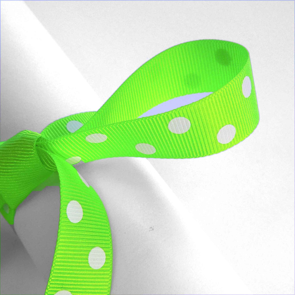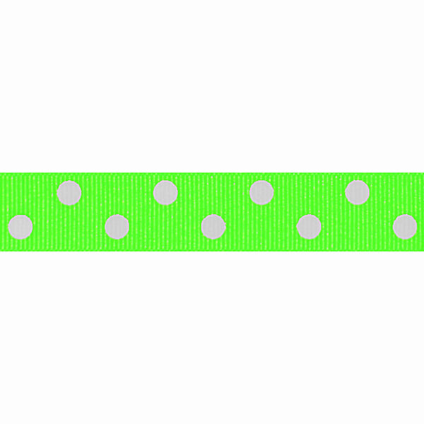 16mm Fluorescent Green and White Polka Dot Ribbon by Berisfords is a fun dotty ribbon for lots of fun and to make sure that you get noticed! This bright fluorescent green and white polka dot ribbon has a regular pattern of white small polka dots on a bright neon green background.