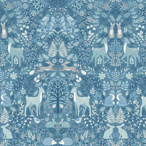 Dusk Trail Blue cotton fabric by Makower, 014/B, is part of the Foxwood collection. There is a mirror pattern in various shades of blue with a scattering of white and grey of deer, rabbits and foxes surrounded by foliage and flowers.