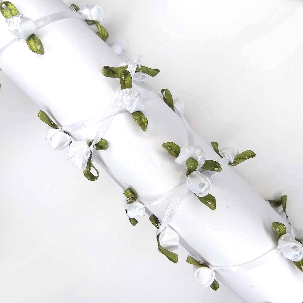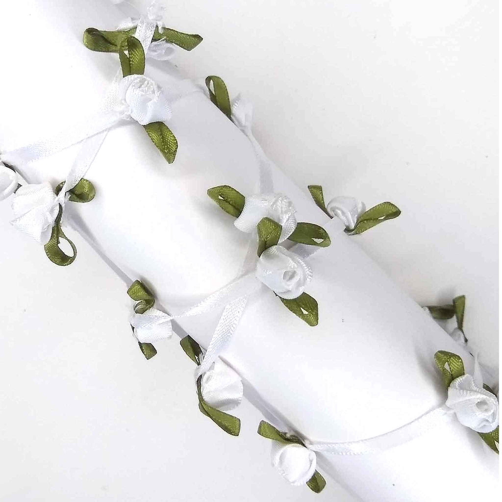 A pretty and delicate white ribbon trimming with matching roses made from the same colour ribbon at regular intervals along the ribbon. This is perfect for weddings and bridesmaid's dresses, little girl's party clothes, new born babies and all your other craft projects.