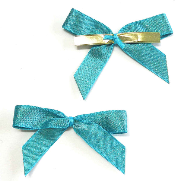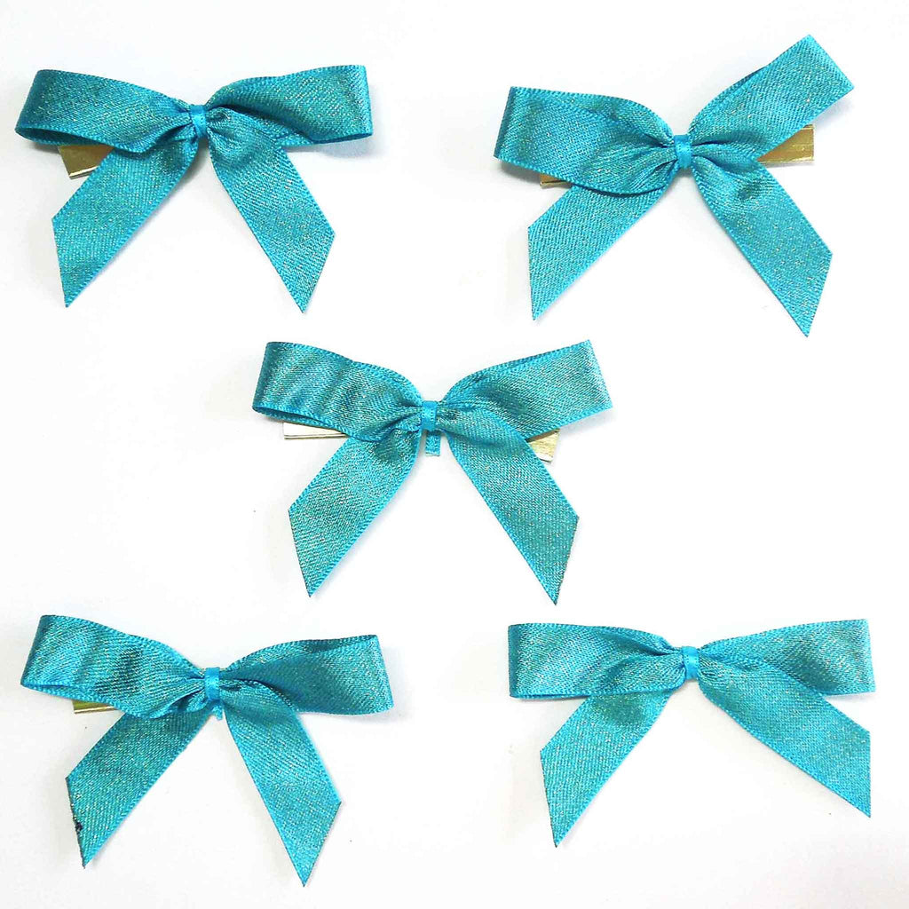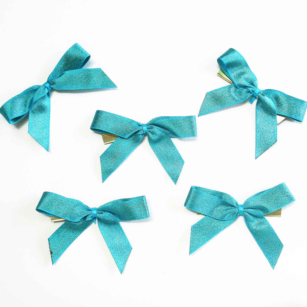 Pack of 5 handmade fabric ribbon bows. The bows have been made in the UK from 15mm Peacock Blue Glitter Satin Ribbon and have a wire twist fastening sewn to the back of the bow. Perfect for weddings, parties and crafts.
