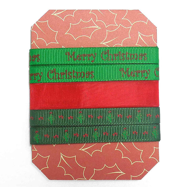 A festive Christmas ribbon collection on a handmade Xmas card with the following 3 grosgrain and chiffon ribbons: