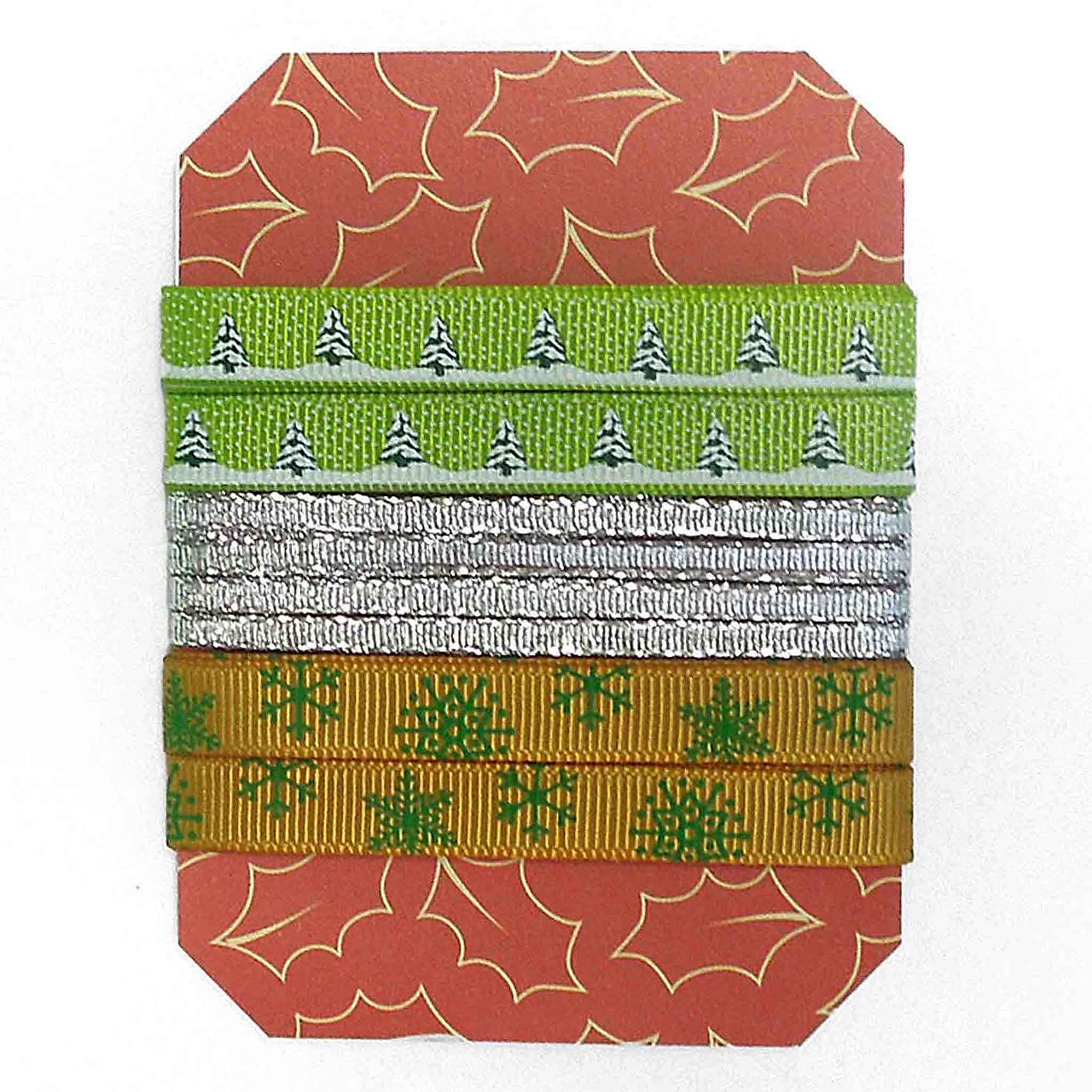 A festive Christmas ribbon collection on a handmade Xmas card with the following 3 grosgrain and metallic ribbons: