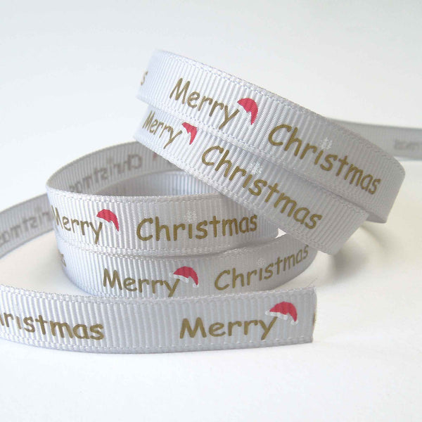 Christmas Ribbon Collection - Grey Merry Christmas and Santa Hats - 3.5 Metres