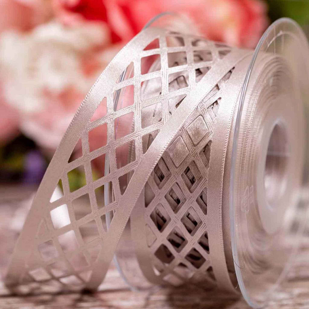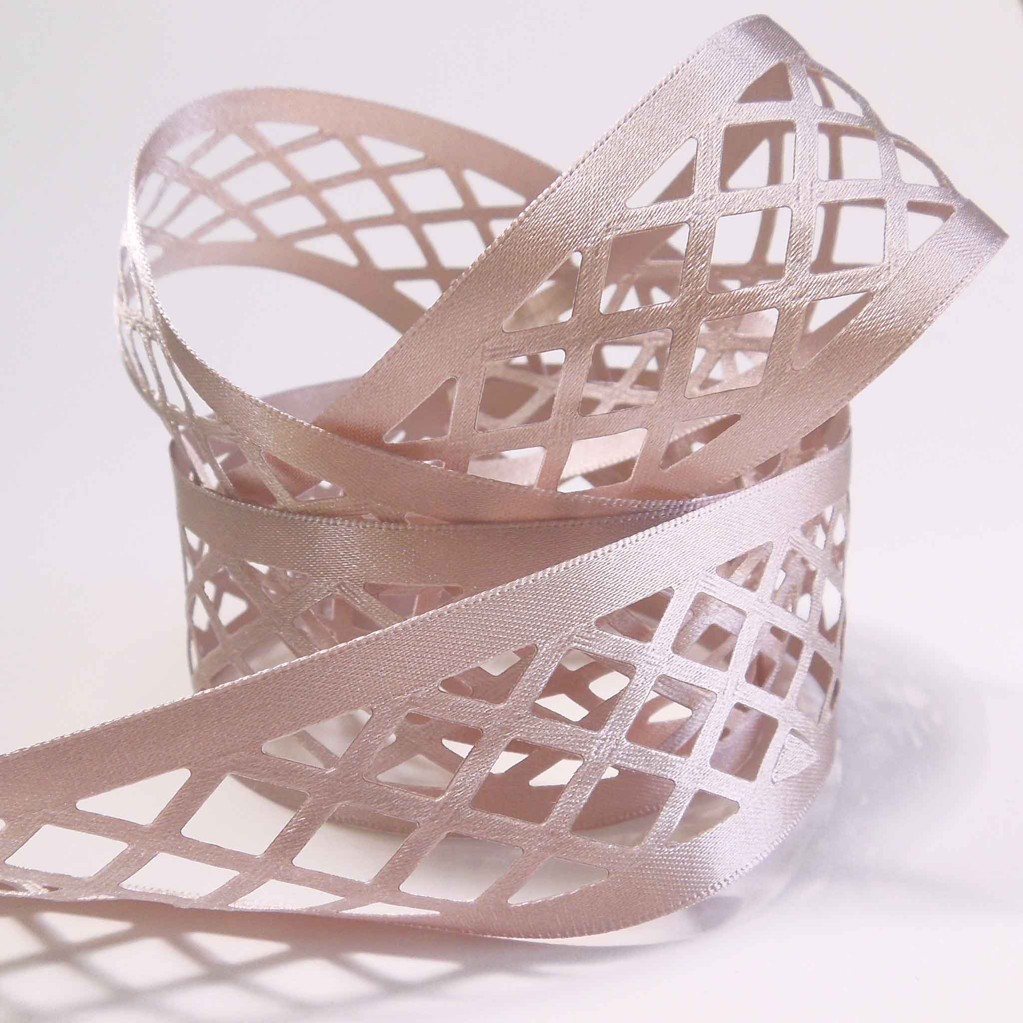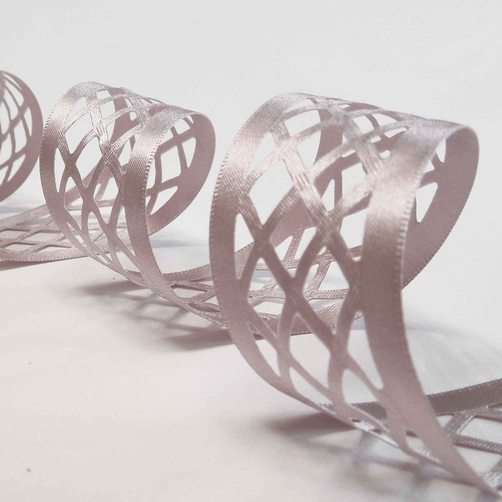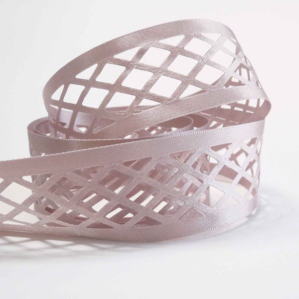 A pretty openwork silver grey ribbon by Berisfords. This is a double satin ribbon with the centre panel cut into an open diamond trellis design.