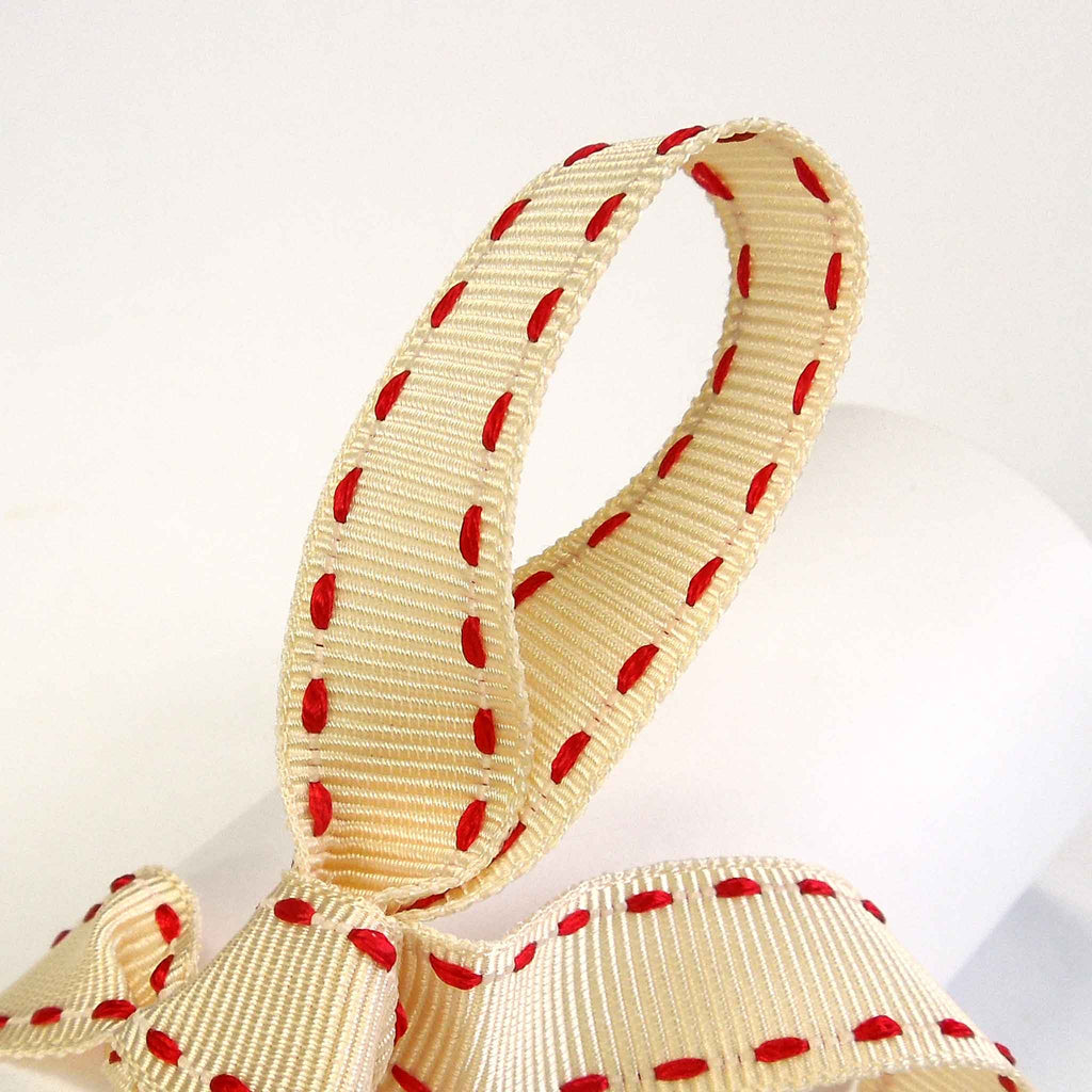 A retro style 15mm ivory and red stitched grosgrain ribbon with parallel red stitched edges on an ivory ribbon.