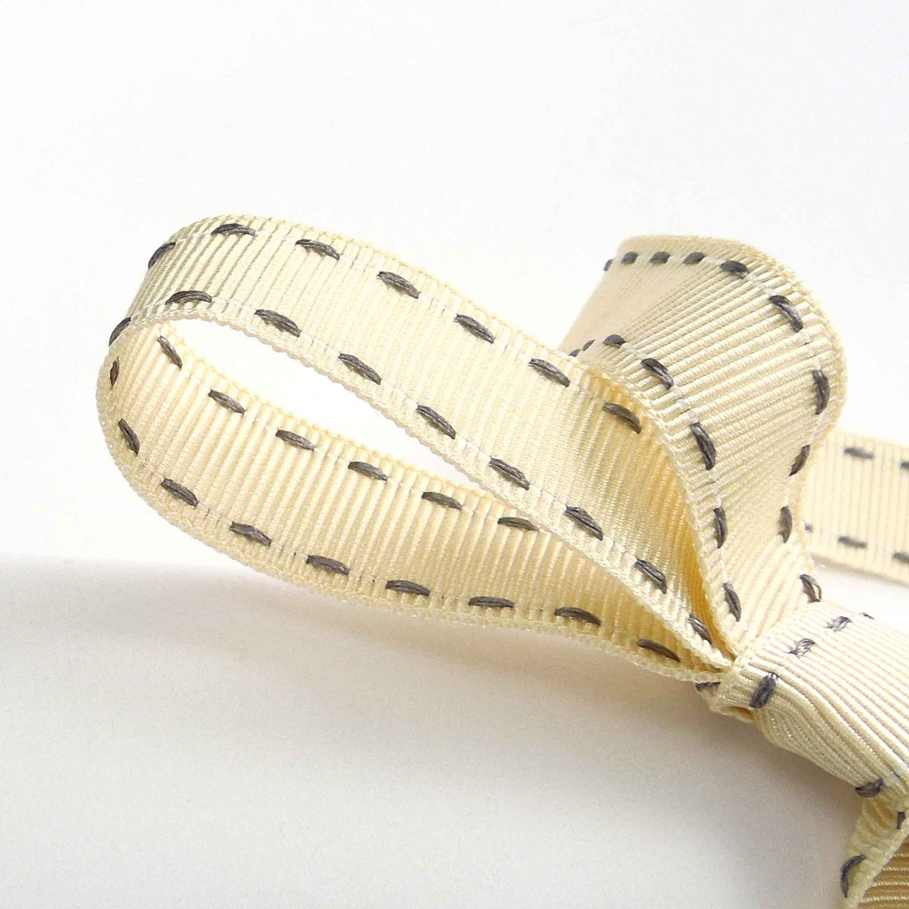 A retro style 15mm ivory and silver grey stitched grosgrain ribbon with parallel grey stitched edges on an ivory ribbon.