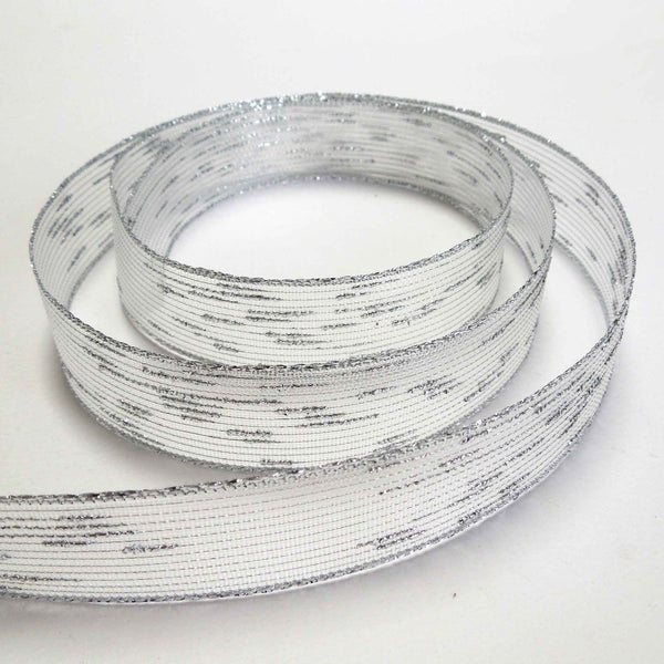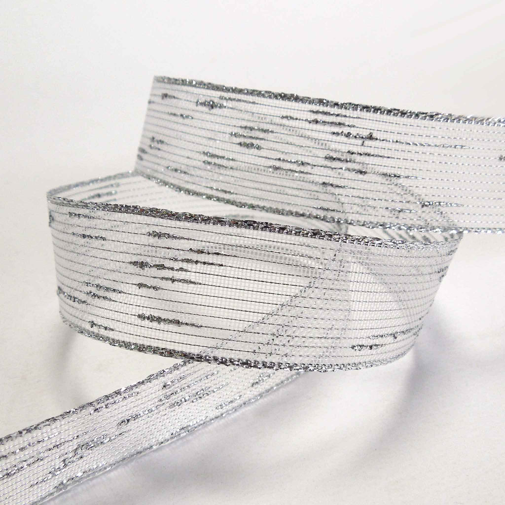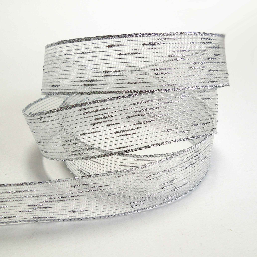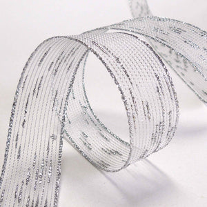 A silver mesh ribbon by Berisfords which has a silver textured effect on a sheer base. There are very fine silver lines running down the length of the ribbon with larger silver textured areas plus solid silver effect edges. This ribbon is quite firm and would be great for holding the shape of bows and other decorations.