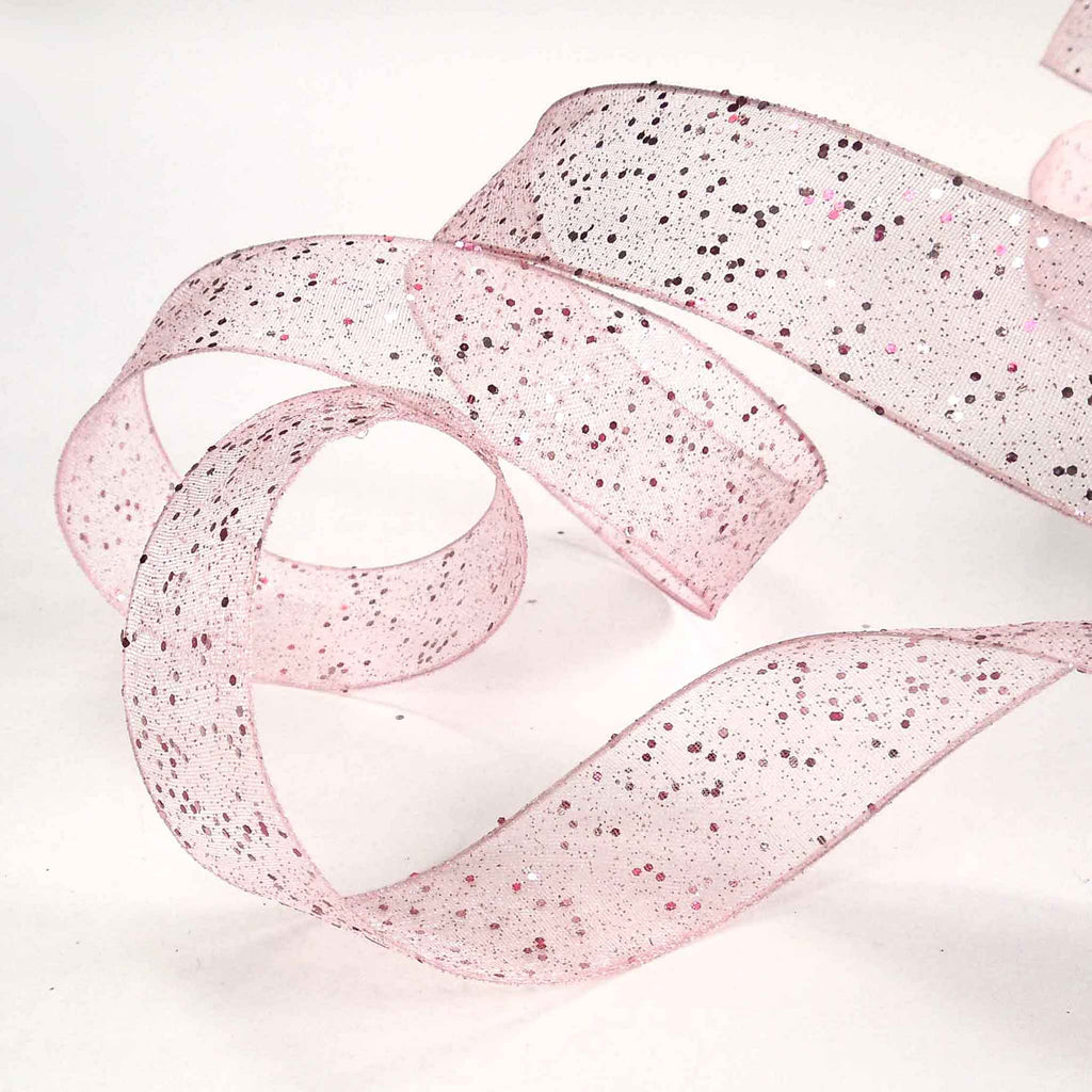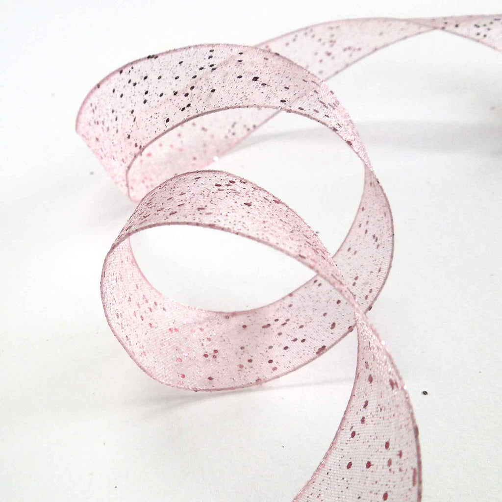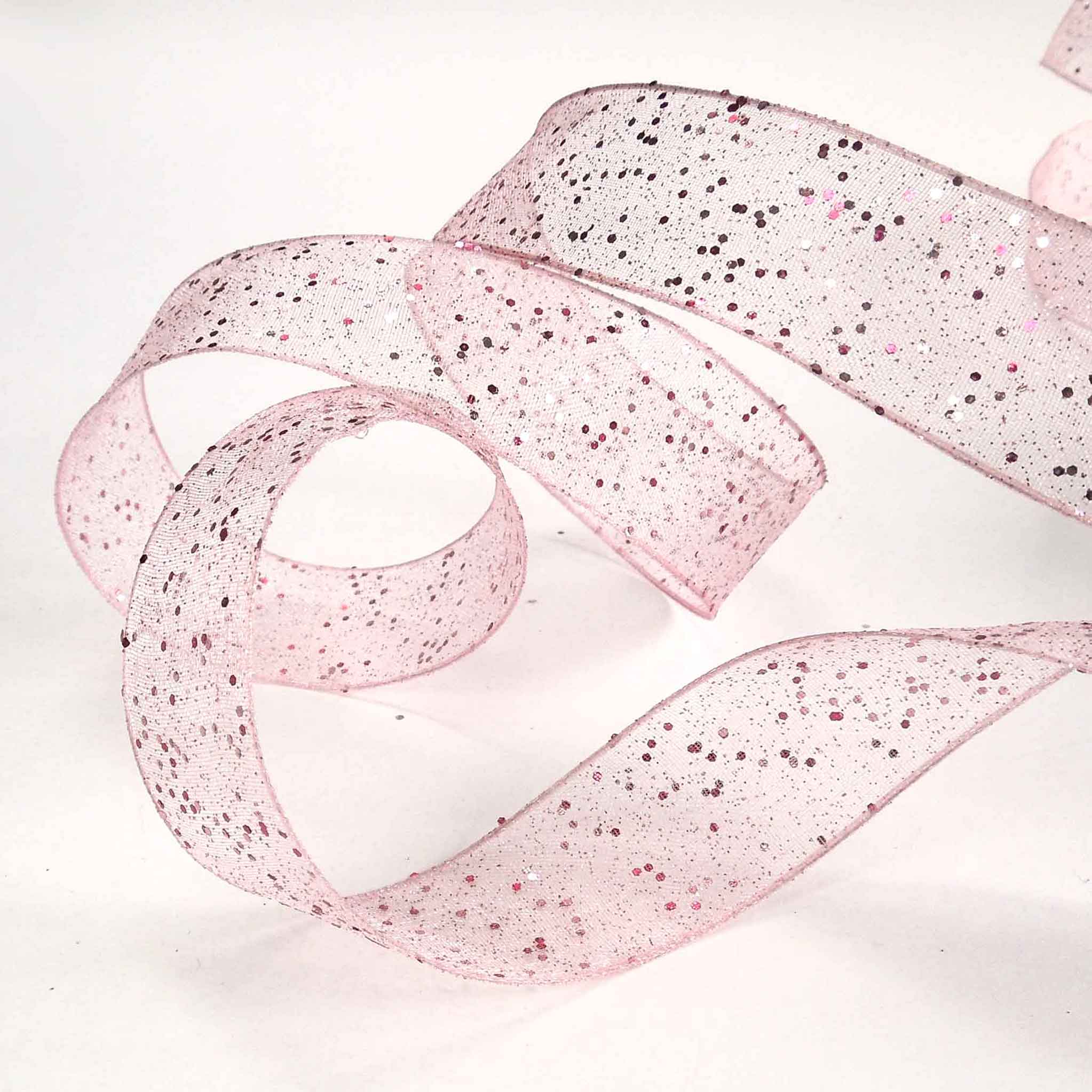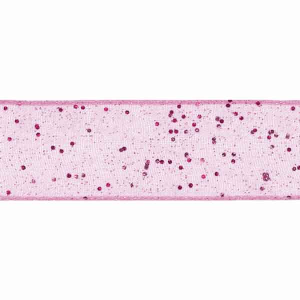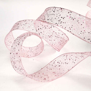 A pink sheer ribbon by Berisfords with a sprinkling of glitter creates a delicate and effervescent look. The wired edge assists in moulding the ribbon to shape, especially for bows for floral and decorative display. This is an elegant decorative gift wrap ribbon, perfect for many different colour schemes.