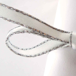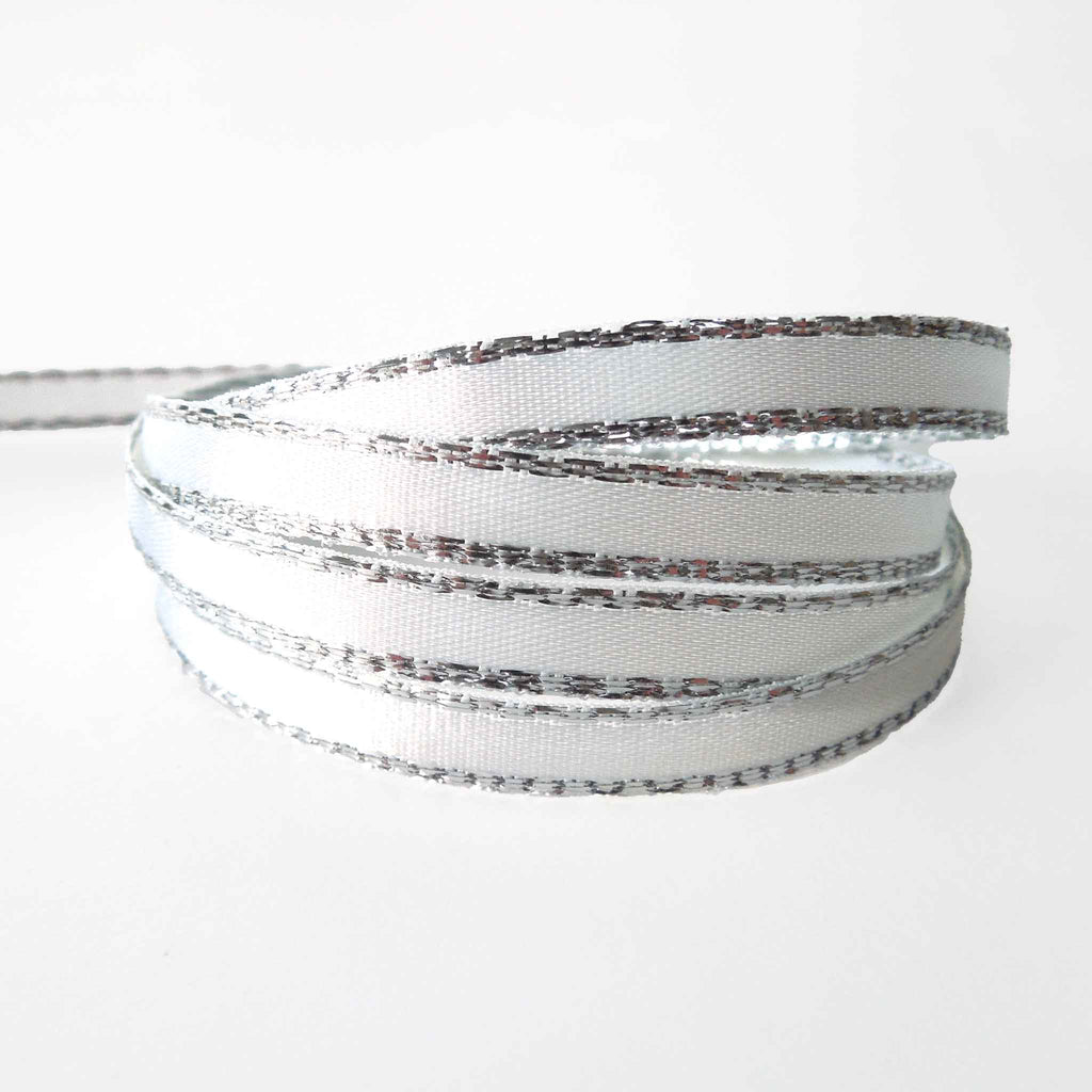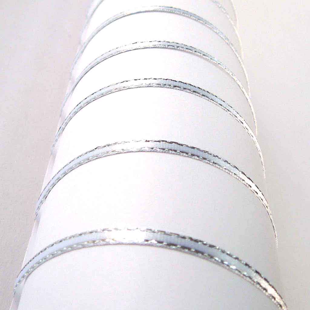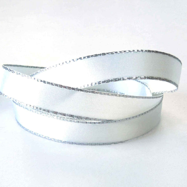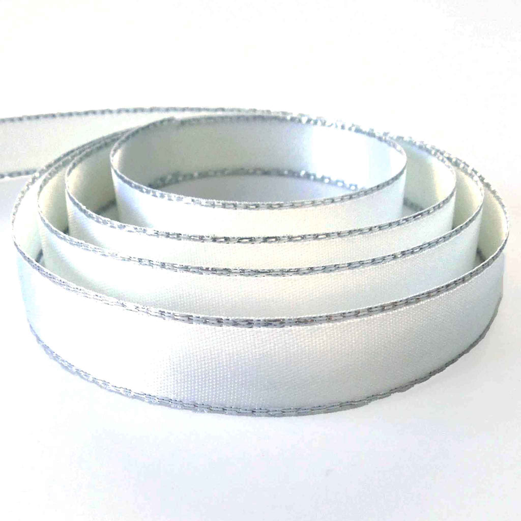 A luxurious white satin ribbon with a decorative silver metallic edge by Berisfords. All the luxury of a satin ribbon but a little added sparkle. Use this ribbon to add just a touch of sparkle to your projects very sophisticated and stylish!
