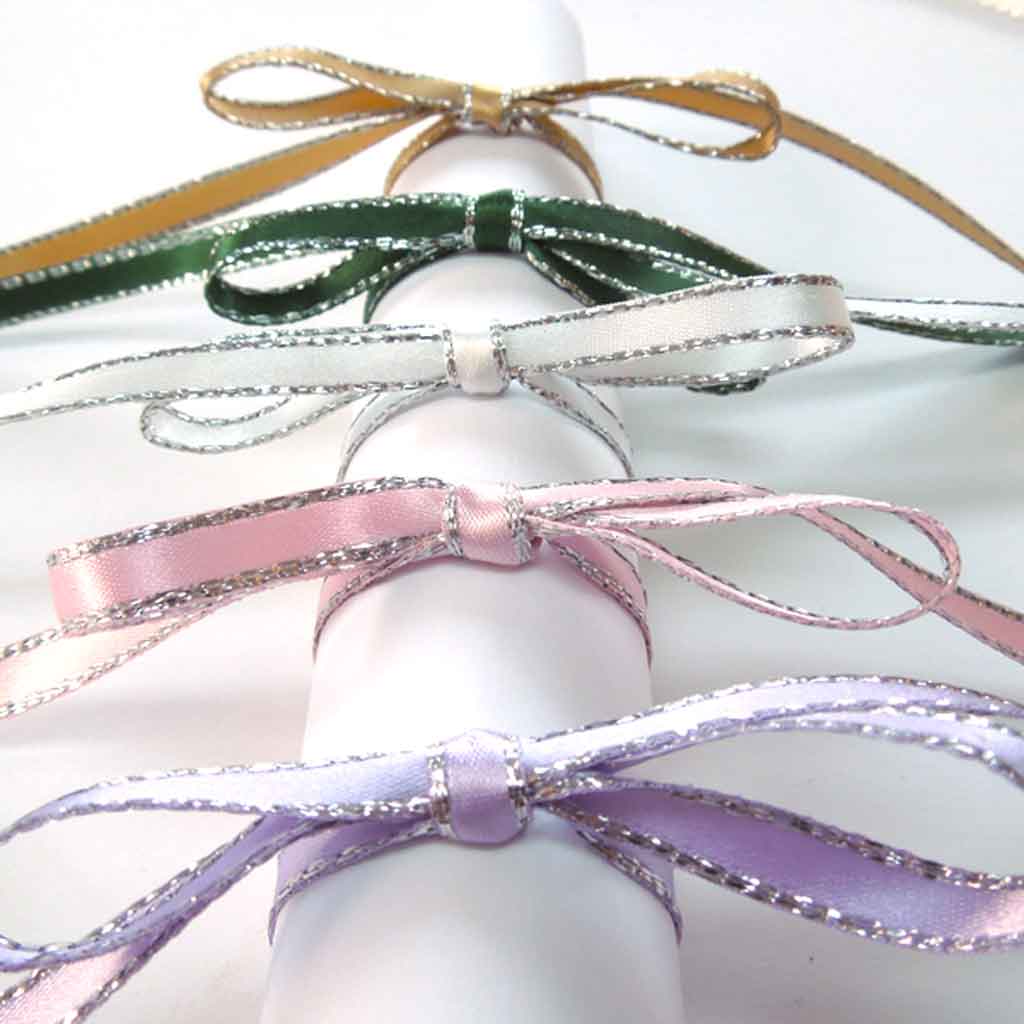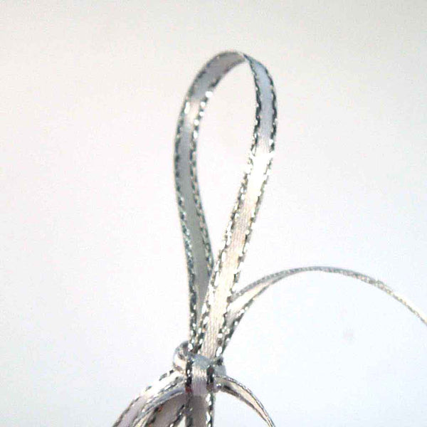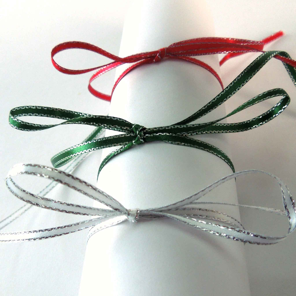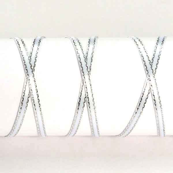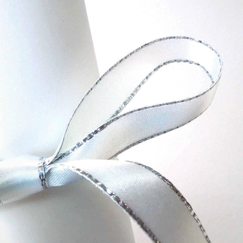 A luxurious white satin ribbon with a decorative silver metallic edge by Berisfords. All the luxury of a satin ribbon but a little added sparkle. Use this ribbon to add just a touch of sparkle to your projects very sophisticated and stylish!