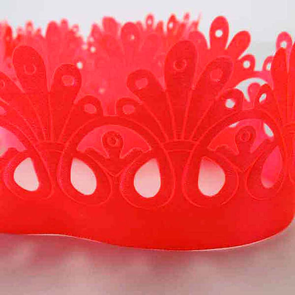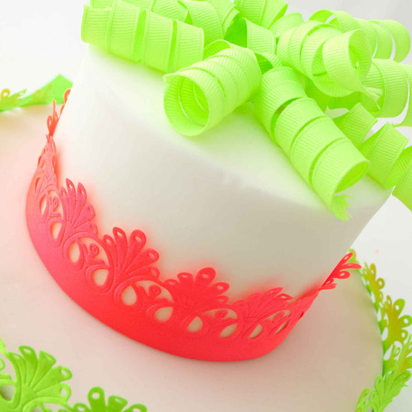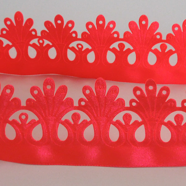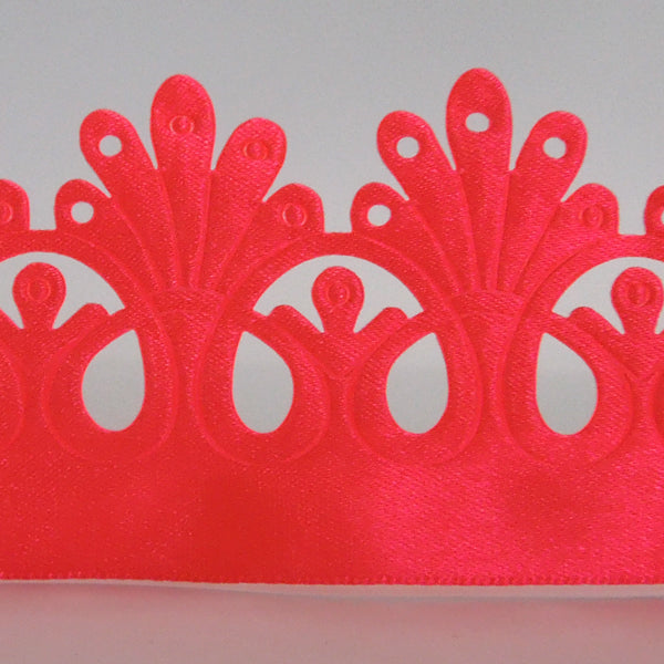 A bright fluorescent ribbon in bright pink with a pretty flower fan cut-out pattern. The laser embossed patterns and lace effect cut edges produce both an embossed and intricate ornate flower fan pattern.