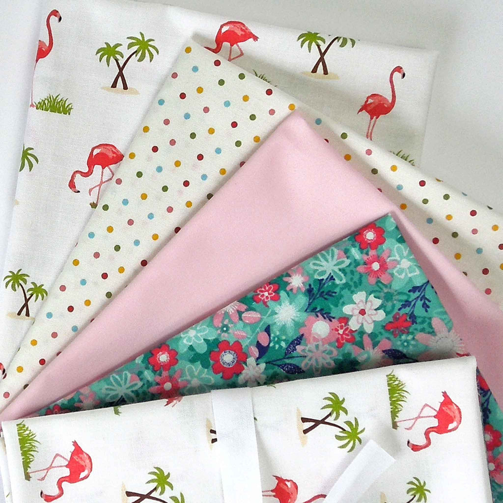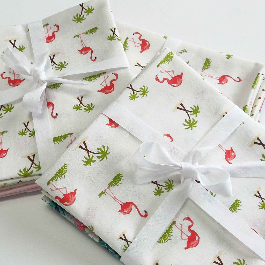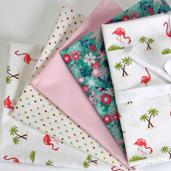 Pink Flamingo on White fat quarter pack of 4 Makower, Riley Blake and Rose & Hubble fabrics is a co-ordinating pink flamingo, polka dot and plain fabric pack. It contains 4 fat quarters in 4 different designs, perfect for many quilting or craft projects. The packs are tied with white cotton tape.