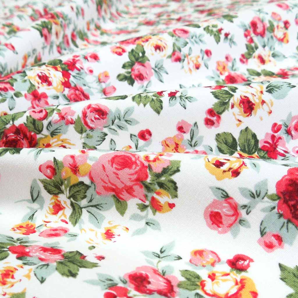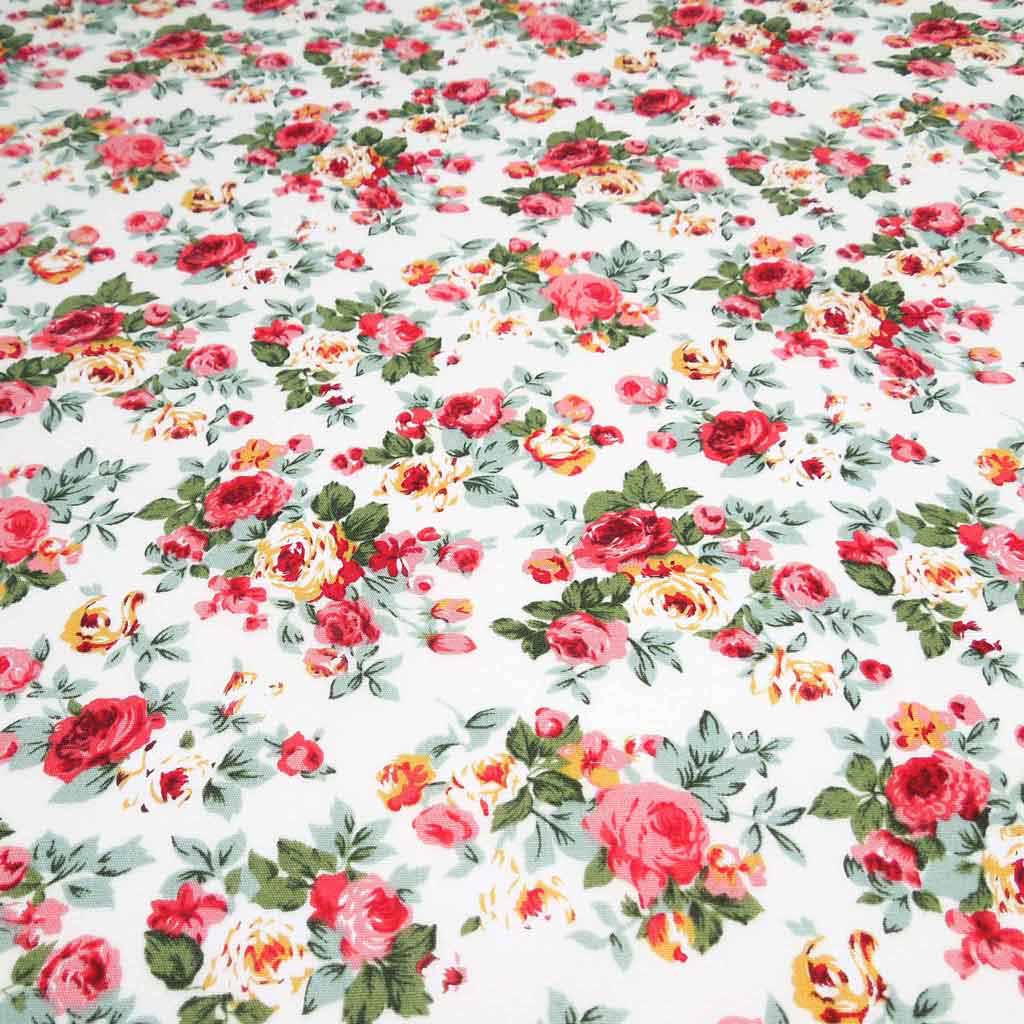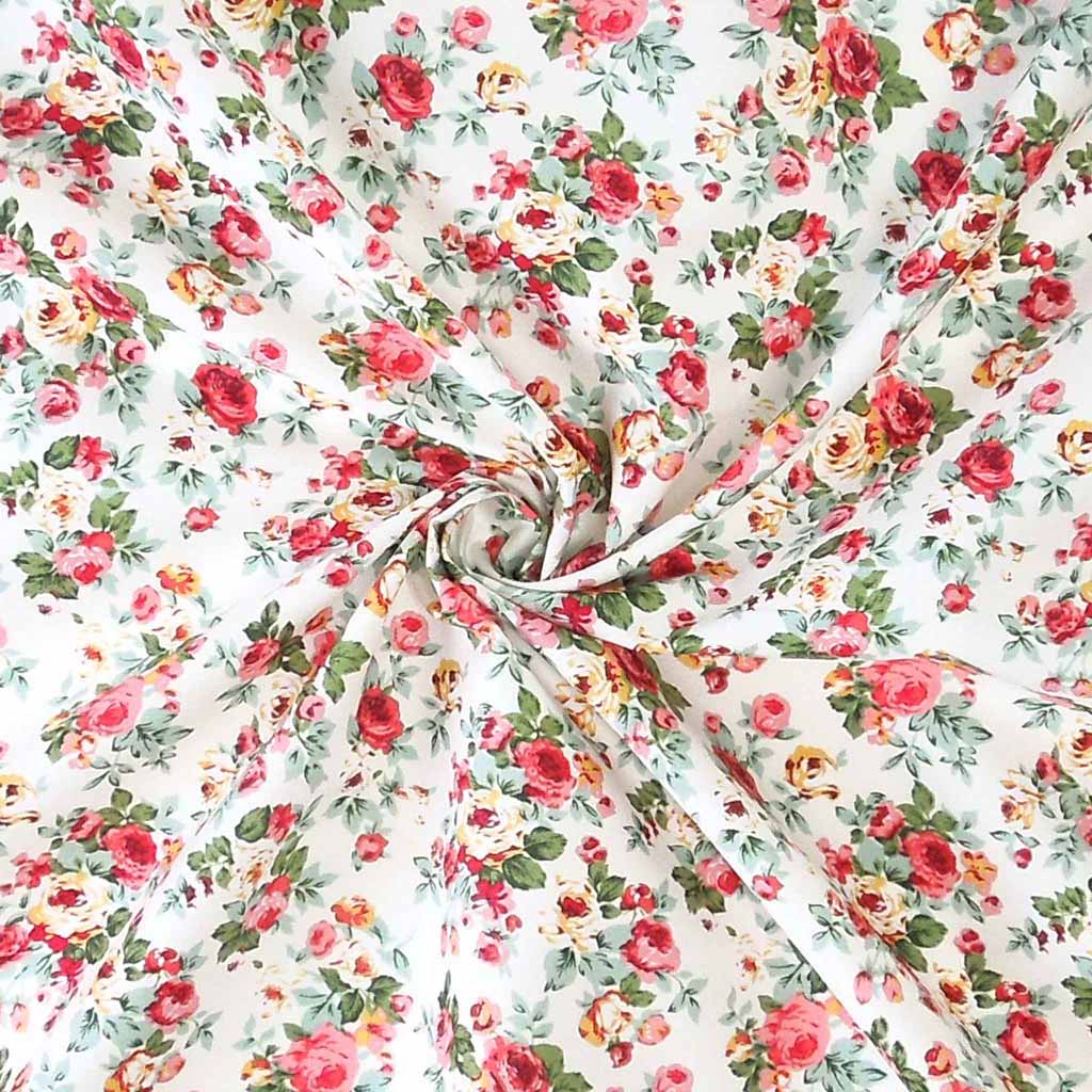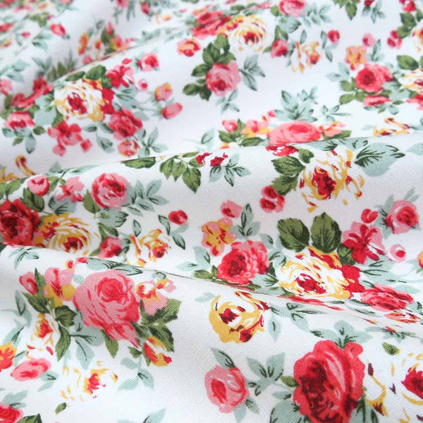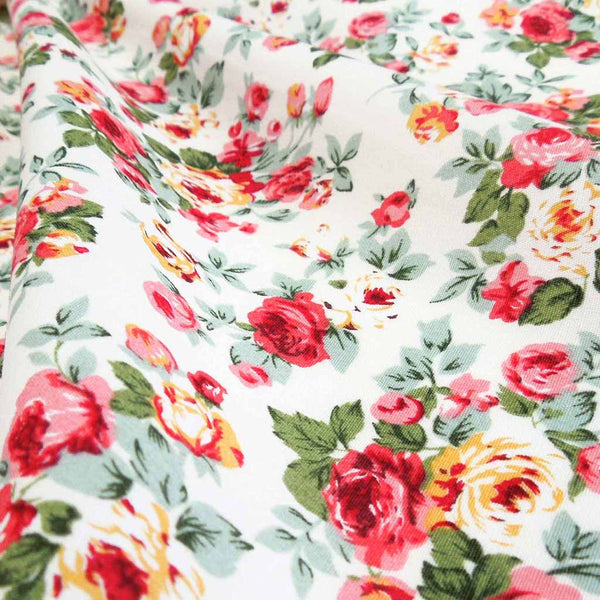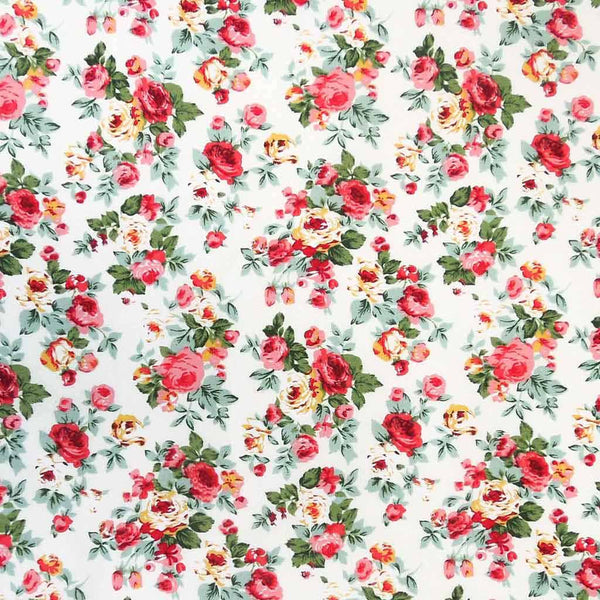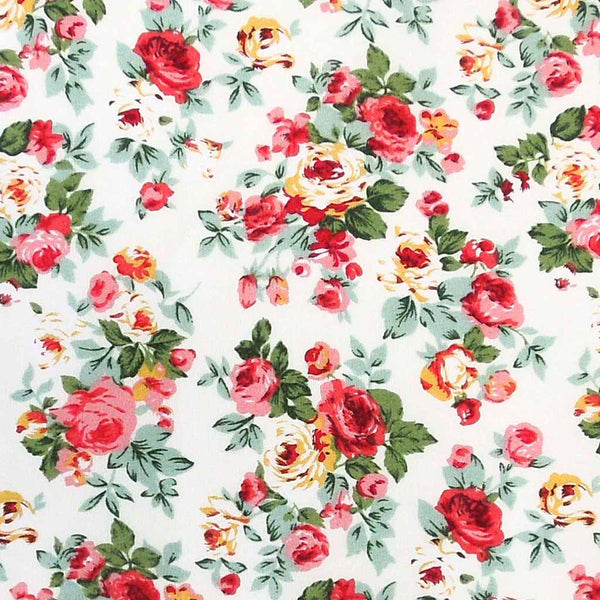 Pink rose bouquets cotton fabric by Rose & Hubble is a pretty vintage style floral fabric. The pink, red and yellow rose bouquets, complete with green leaves are scattered across an ivory background. A lovely gentle retro style fabric, perfect for vintage inspired dressmaking and crafts.